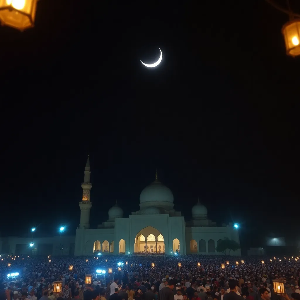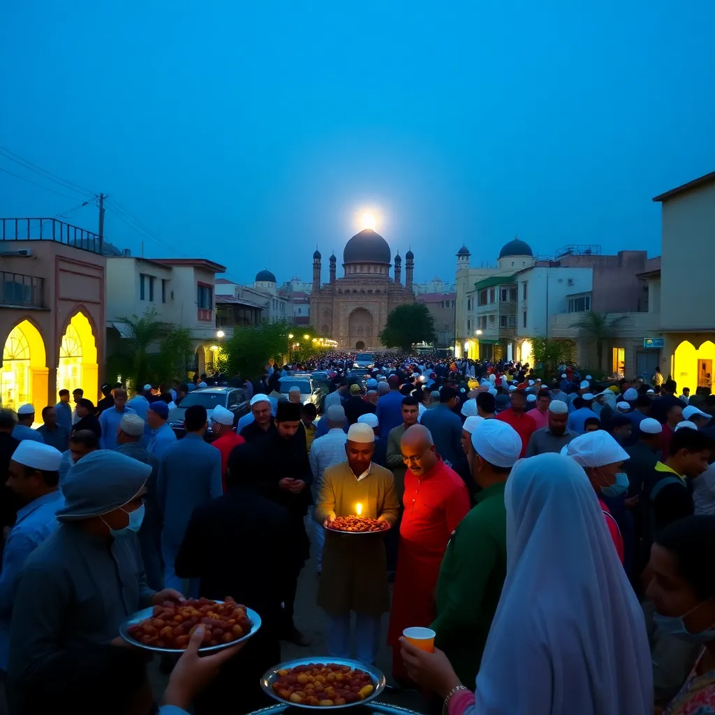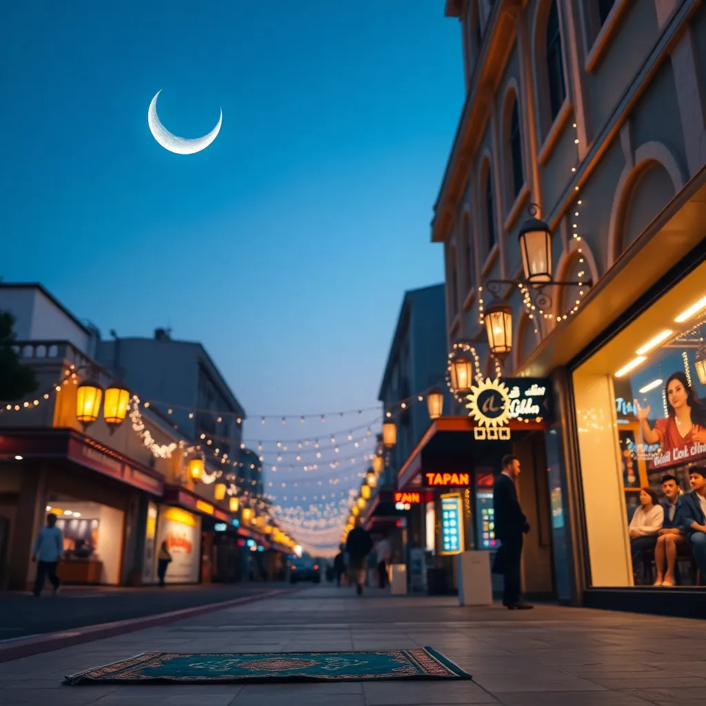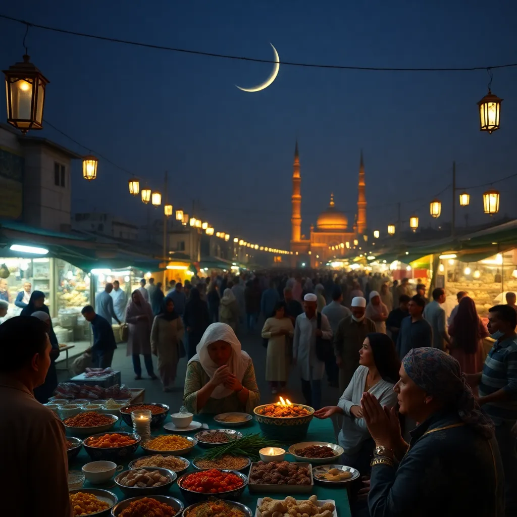 As the crescent moon rises, the city comes alive with the spirit of Ramadan. Muslims gather in mosques, sharing iftars and breaking fasts together. The scent of dates and samosas wafts through the air. Capture the vibrant colors and warm atmosphere of this sacred month in a stunning AI-generated image.