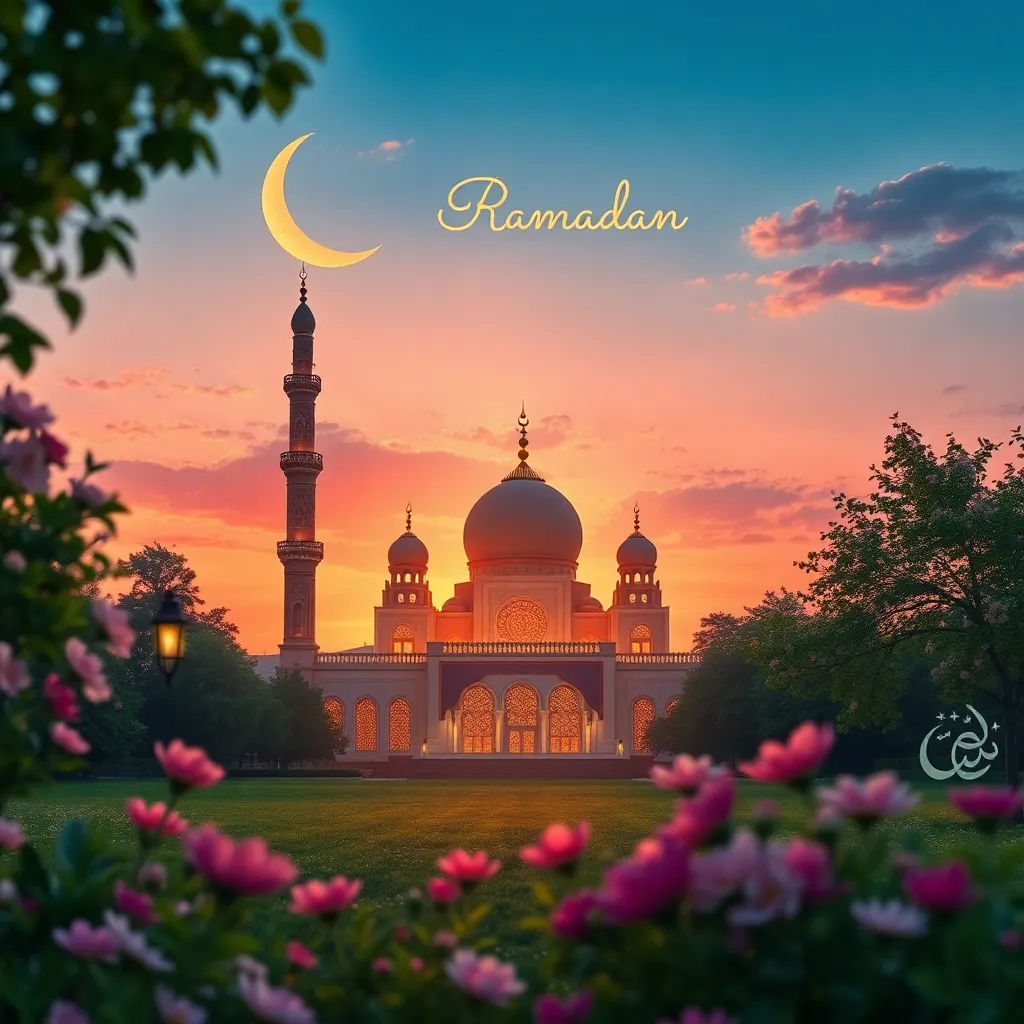 Create a serene and vibrant AI image that captures the essence of Ramadan. Depict a beautiful mosque or masjid at sunset, surrounded by lush greenery and blooming flowers. Incorporate soft, warm lighting and subtle crescent moon silhouettes. Incorporate Arabic calligraphy or lanterns to add a touch of elegance and spirituality.