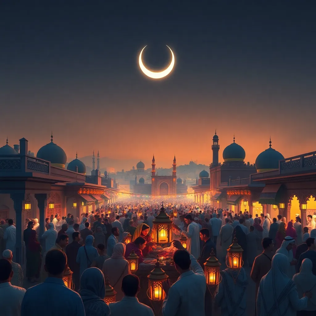 Capture the essence of Ramadan in a vibrant AI-generated image. Depict a serene nighttime scene in a bustling city, with the crescent moon shining bright above a crowd of people breaking their fast together. Incorporate traditional Middle Eastern architecture, lanterns, and a sense of community and togetherness.