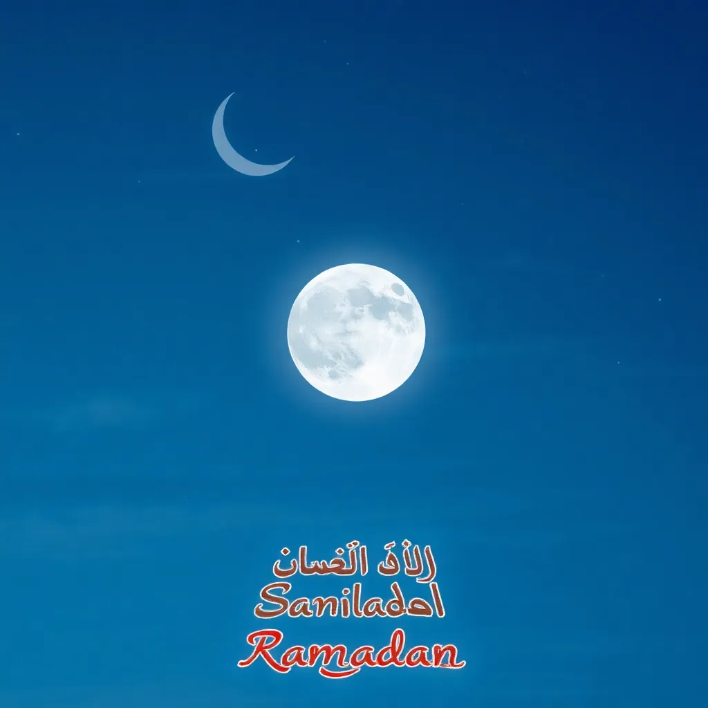 Create a serene and vibrant image that captures the essence of Ramadan. Depict a tranquil night sky with a full moon, surrounded by delicate Arabic calligraphy and intricate Islamic patterns. Incorporate a faint crescent moon and stars, symbolizing the arrival of the holy month. Convey a sense of peace and contemplation.