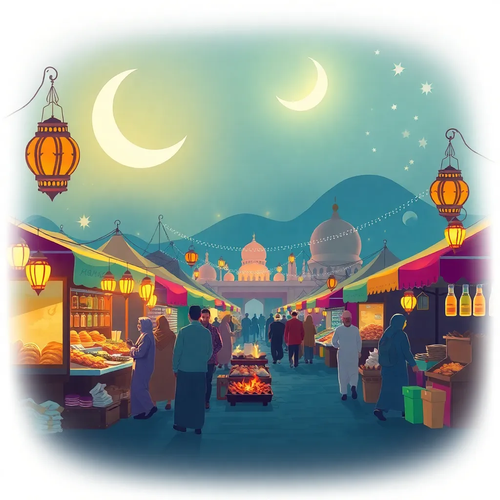 Create a serene and vibrant AI image depicting a bustling Ramadan night market. Include a crescent moon shining bright, colorful lanterns and twinkling stars, and a variety of traditional Middle Eastern foods and drinks being sold. Capture the warmth and joy of the community coming together to celebrate the holy month.