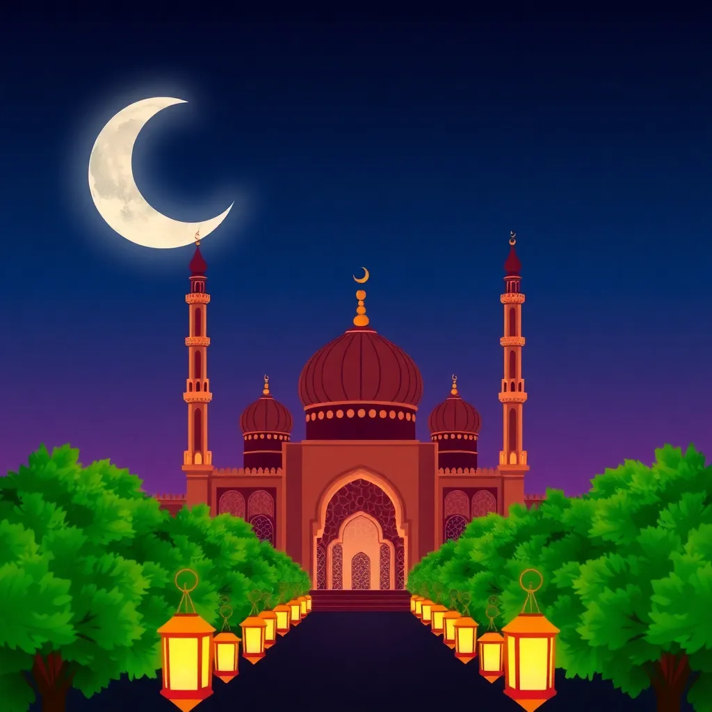 Create an image of a serene and vibrant Ramadan scene. Depict a moonlit night sky with a crescent moon shining bright. In the foreground, show a beautifully decorated mosque with intricate arches and minarets. Surround the mosque with lush green trees and a pathway of lanterns, symbolizing peace and spirituality.