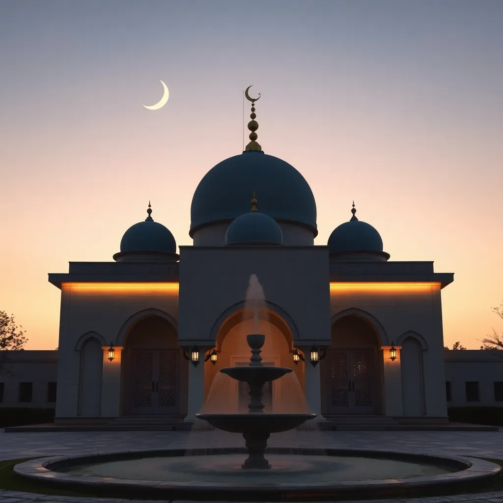 Create a serene AI image of a quiet mosque at sunrise during Ramadan, with a crescent moon hanging low in the sky. Softly lit lanterns adorn the exterior, while a gentle mist rises from the fountain. The atmosphere is peaceful, inviting, and contemplative, capturing the spiritual essence of the holy month.