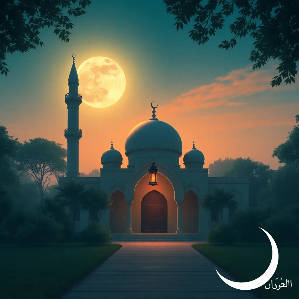 Create a serene AI image depicting a peaceful evening during Ramadan. A full moon casts a warm glow on a quiet mosque, surrounded by lush greenery. A single lantern hangs from the entrance, softly illuminating the path. The atmosphere is tranquil, inviting contemplation and reflection. Incorporate subtle calligraphy and crescent moon motifs.