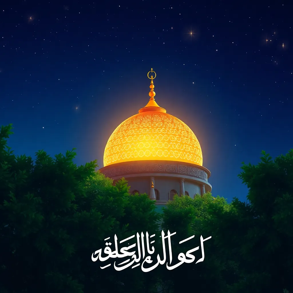 A serene nighttime scene of a mosque's illuminated dome, surrounded by lush greenery and twinkling stars. Incorporate traditional Islamic motifs, such as intricate calligraphy and geometric patterns, to create a visually stunning and culturally sensitive image that embodies the spirit of the holy month.
