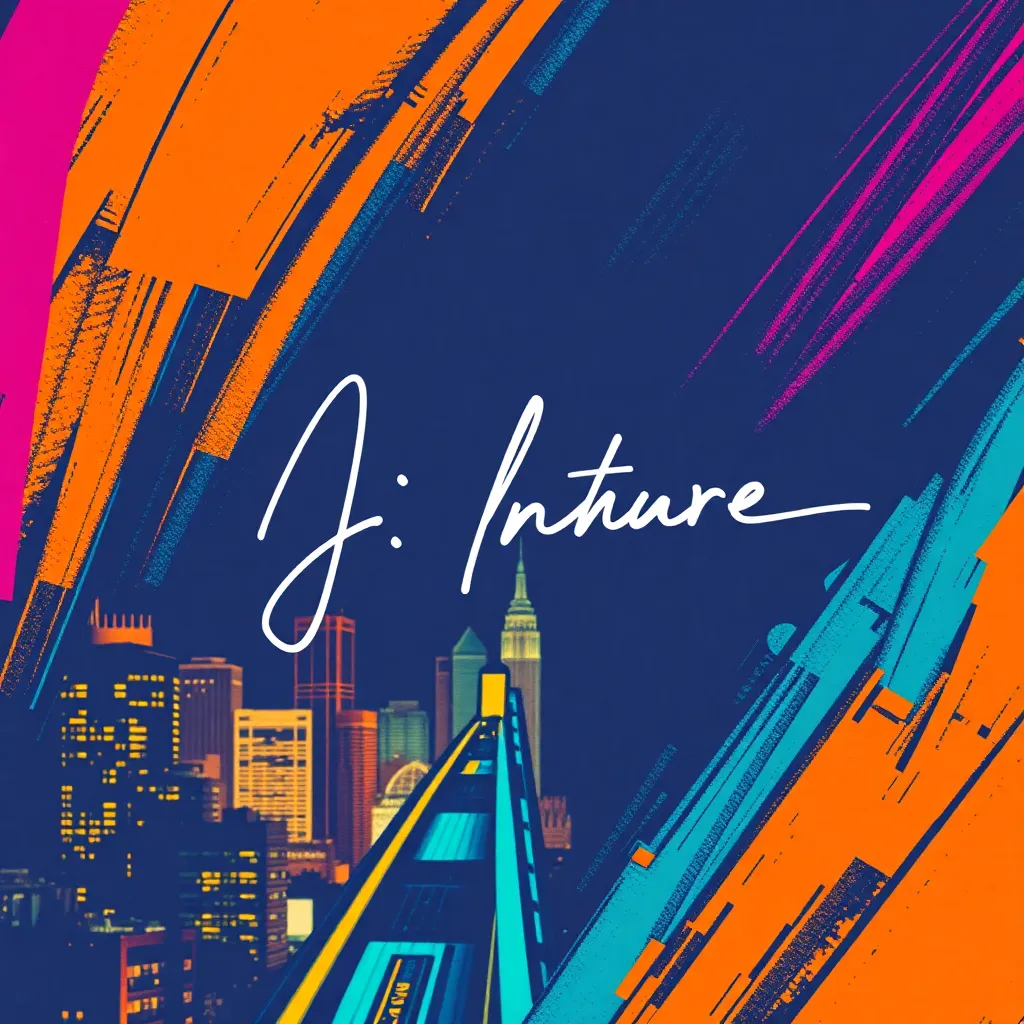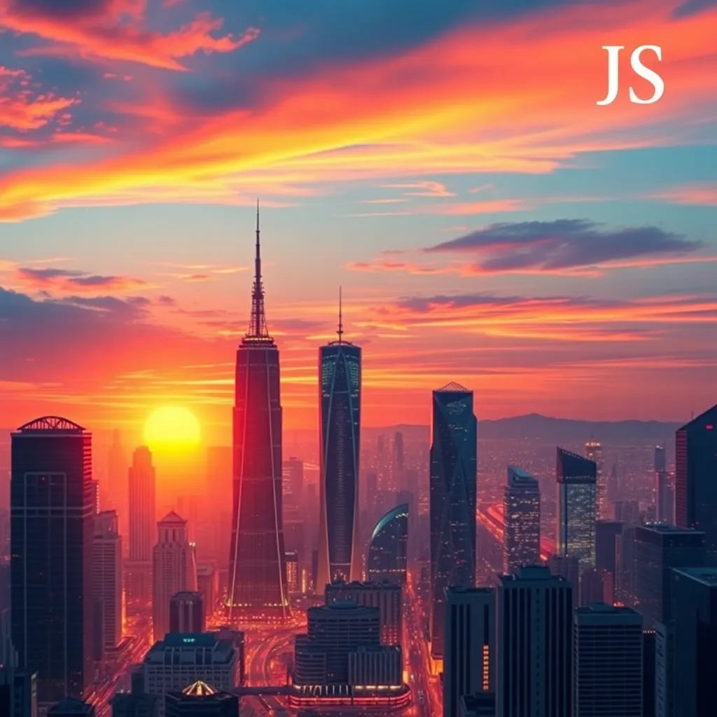 Create an AI-generated image of a futuristic cityscape at sunset, with a subtle signature 'JS' in the top-right corner. Remove the background from the signature to isolate it on a transparent layer. Use vibrant colors and intricate details to make the cityscape pop, while the signature remains sleek and modern.