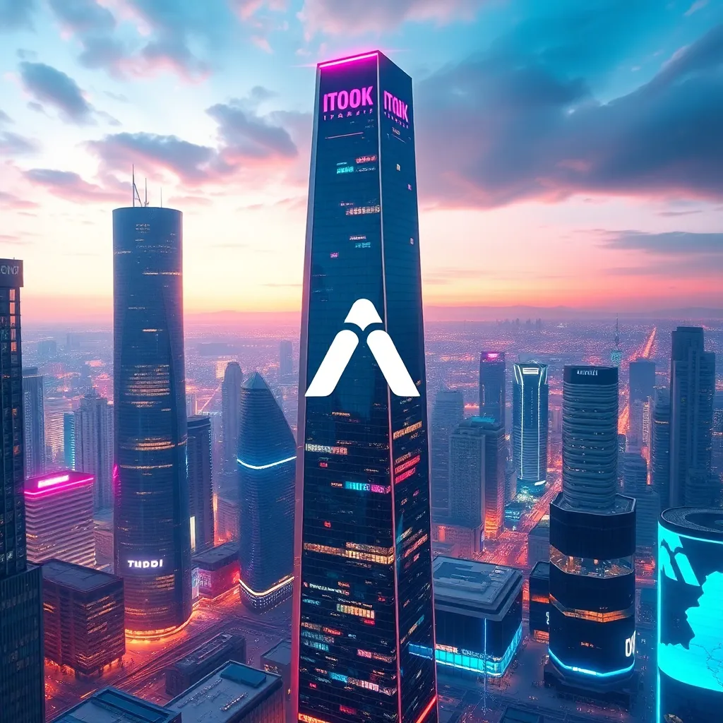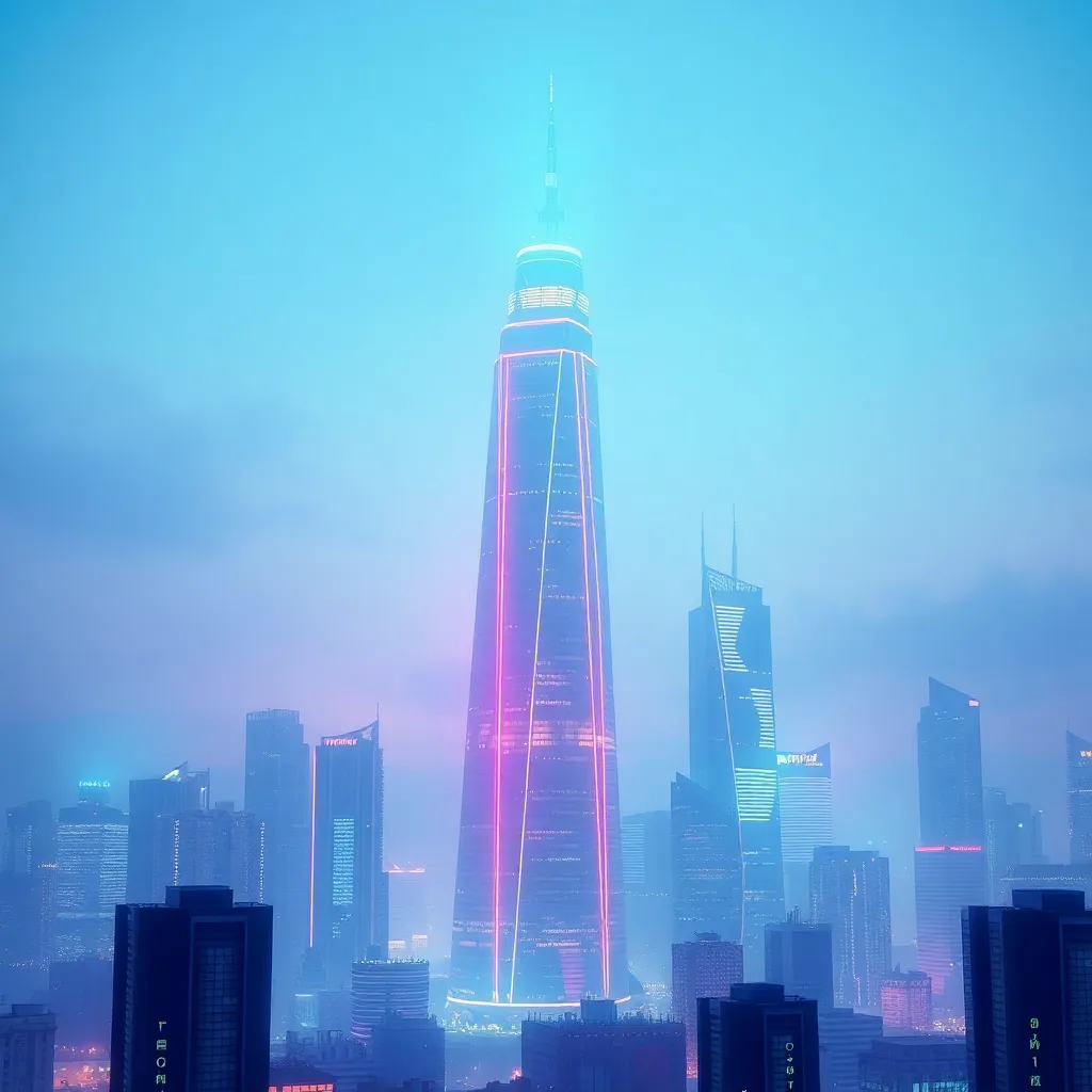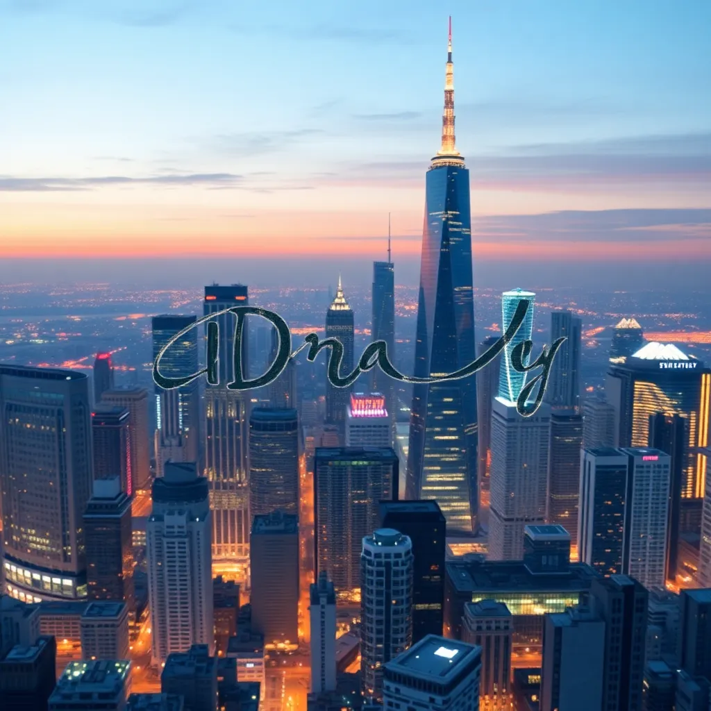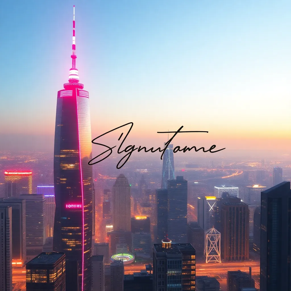 Create an AI-generated image of a futuristic cityscape with a neon-lit skyscraper in the foreground, and a subtle gradient effect in the background. Use a signature font to add a touch of elegance and sophistication. Remove the background from the signature to integrate it seamlessly with the cityscape.