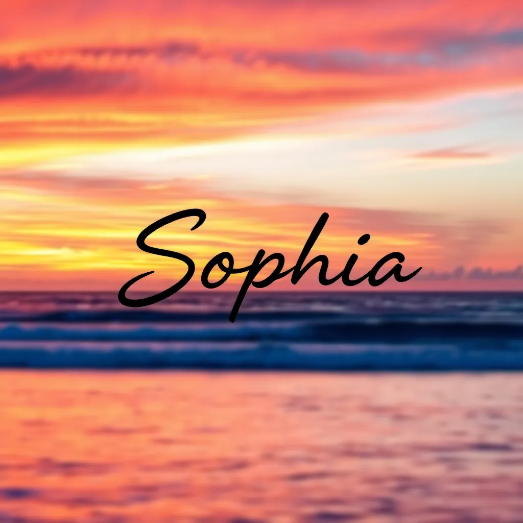 Create an AI-generated image of a stunning sunset landscape with a signature 'Sophia' removed from a white background. The signature should be transparent and seamlessly integrated into the new background, which features vibrant orange and pink hues, gentle clouds, and a serene ocean wave in the distance.