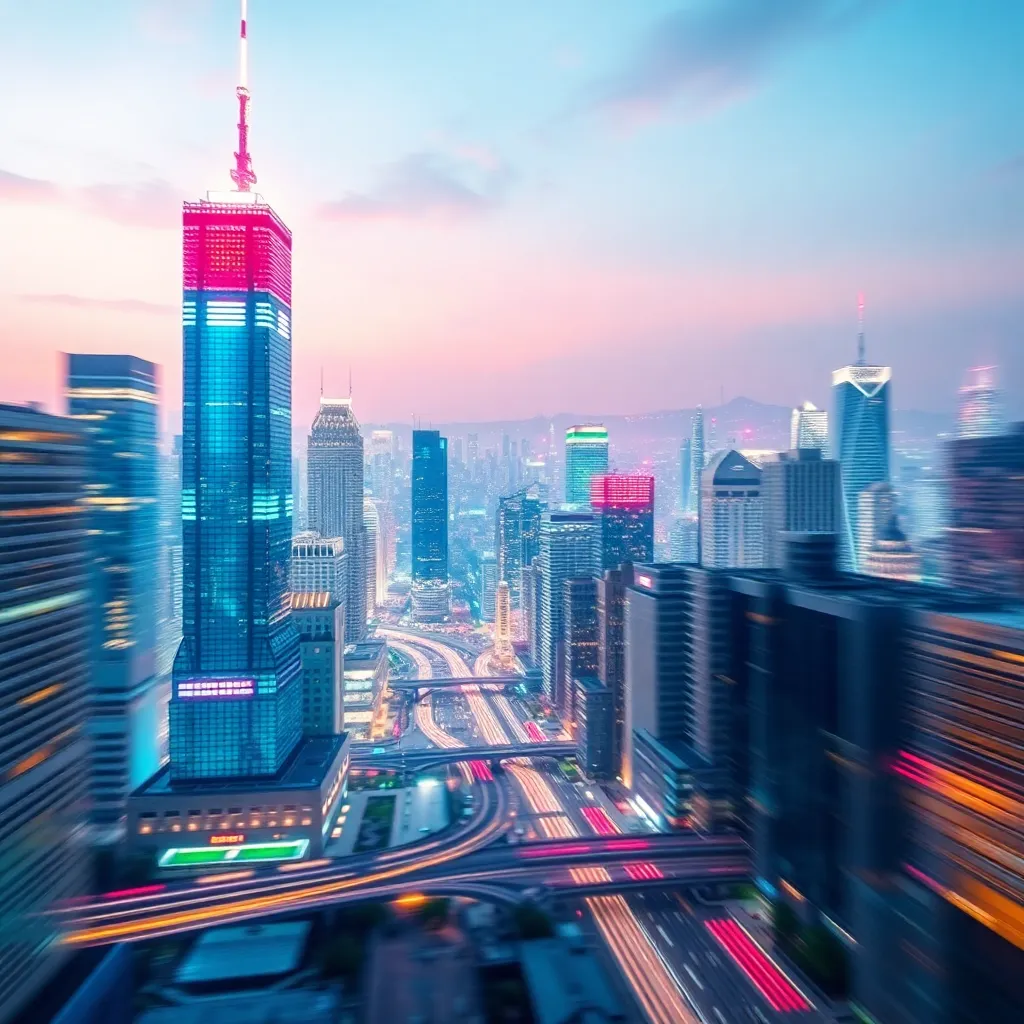 Create an AI-generated image of a futuristic cityscape with a bold, neon-lit skyscraper in the foreground. The background should be removed from a signature font, allowing the city's vibrant colors and details to take center stage. Incorporate subtle motion blur to convey a sense of dynamic energy and movement.