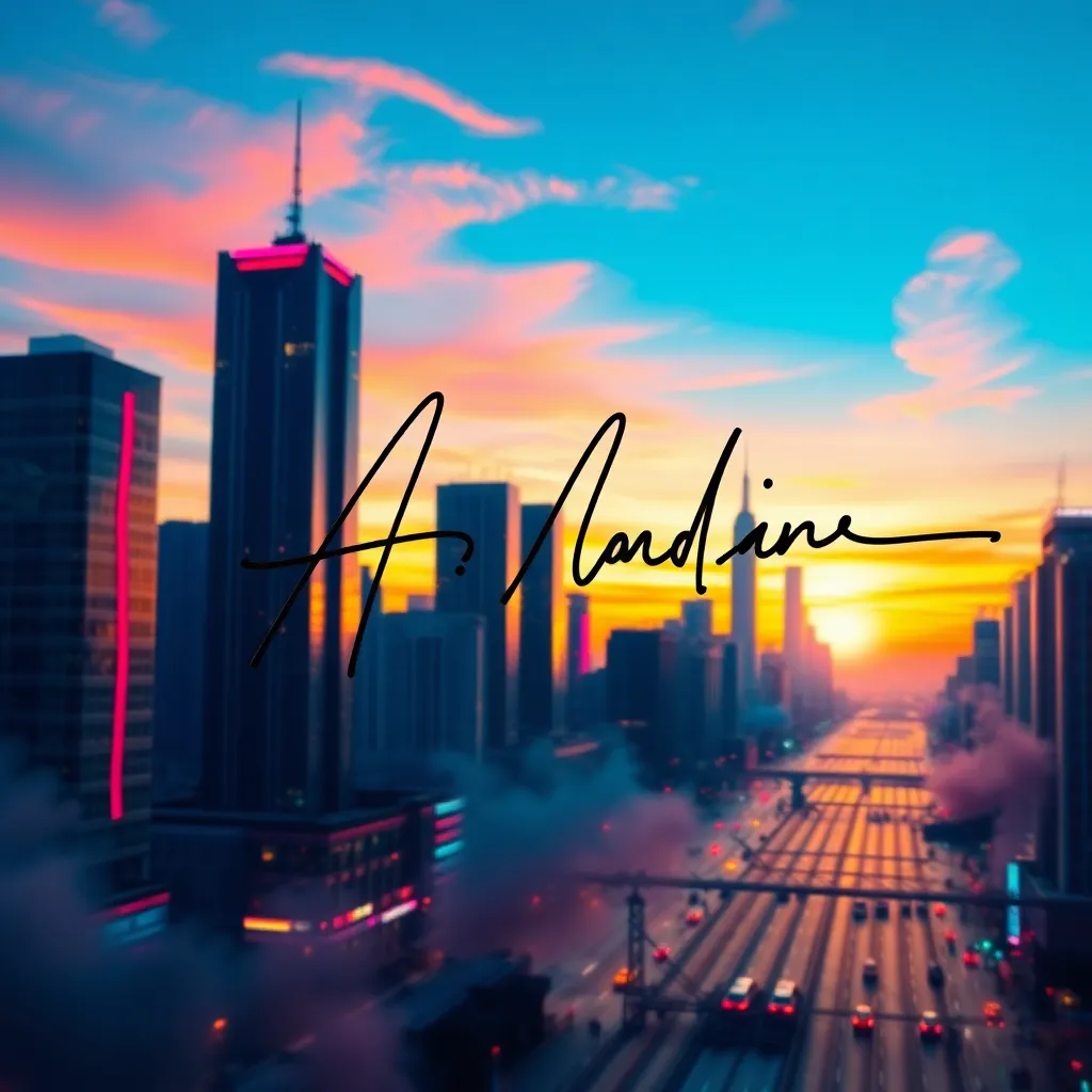 Create an AI-generated image of a handwritten signature with a unique background. The signature should be a stylized version of a real-world celebrity's autograph. The background should be a futuristic cityscape at sunset, with neon lights and skyscrapers. Use a vibrant color palette and add subtle smoke effects.