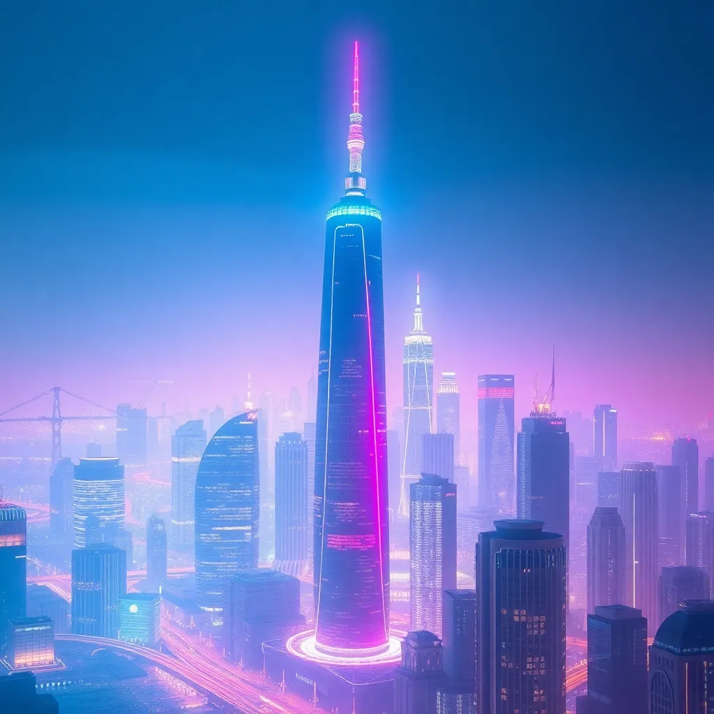 Create an AI-generated image of a futuristic cityscape with a sleek, neon-lit skyscraper in the foreground, surrounded by a haze of blue and purple hues. Incorporate a subtle, transparent background to allow the viewer's eye to focus on the city's vibrant details. Use Remove Background from Signature to achieve a seamless effect.