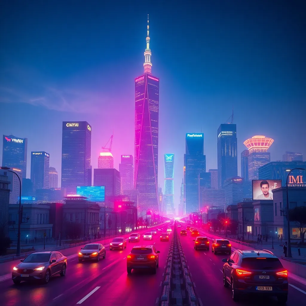 Create an AI-generated image of a futuristic cityscape with a subtle gradient effect. Remove the background from a signature logo of a well-known tech company and incorporate it into the city's skyline. Use vibrant colors and dynamic lighting to make the image stand out. Incorporate moving vehicles and pedestrians.