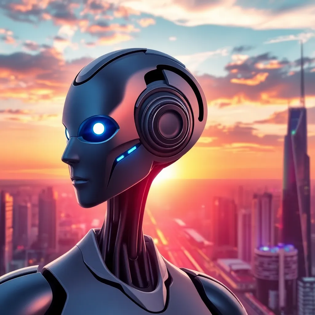 Create an AI-generated image of a futuristic cityscape with a stunning sunset in the background. Remove the background from a signature-style logo featuring a sleek, metallic robot with glowing blue eyes. Incorporate vibrant colors and abstract shapes to create a unique and captivating visual effect.
