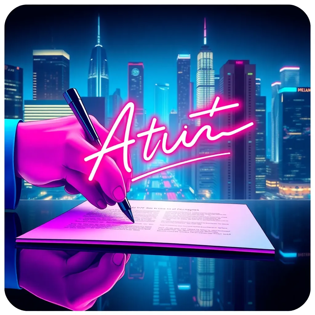 Create a stylized AI image of a hand signing a document, with the background removed to reveal a futuristic cityscape. The signature should be bold and neon-lit, with the city's skyscrapers and neon lights reflecting off the signature. Use a vibrant color palette and add a sense of depth and dimensionality.