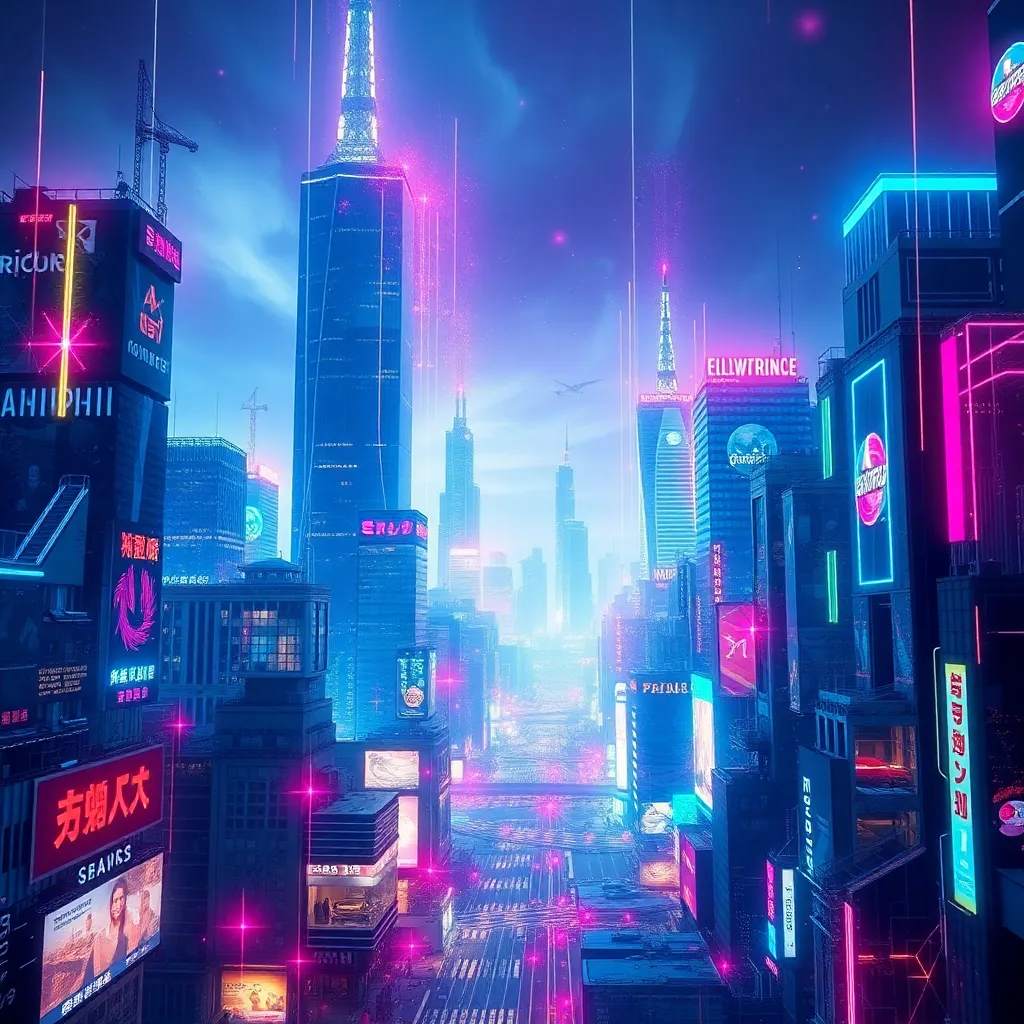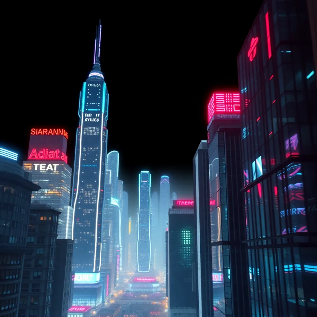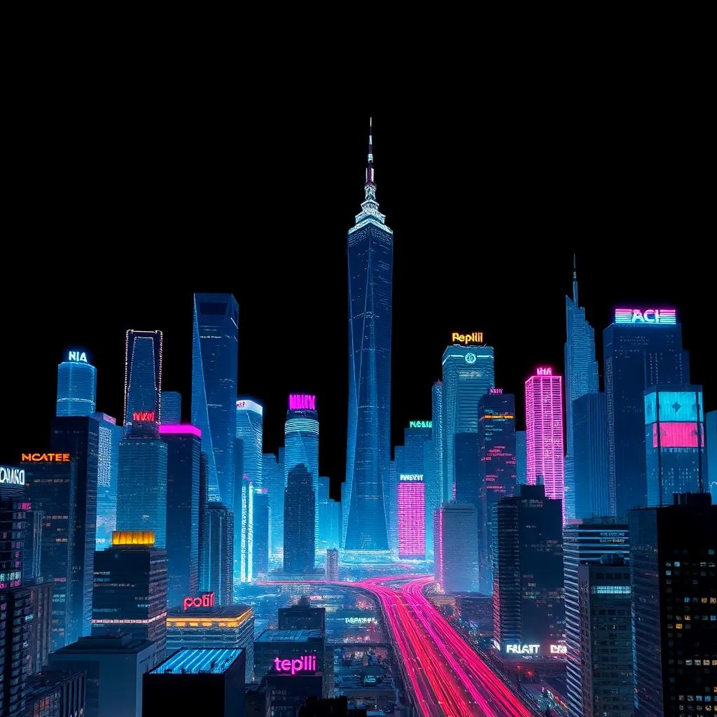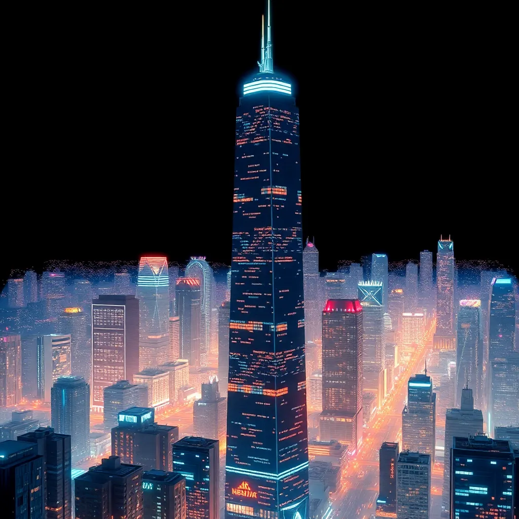 Create an AI-generated image of a futuristic cityscape with a bold, neon-lit skyscraper as the central focus. Remove the black background to reveal a vibrant, 3D city environment with intricate details and realistic textures. The city should have a mesmerizing glow, as if lit by a thousand tiny lights.