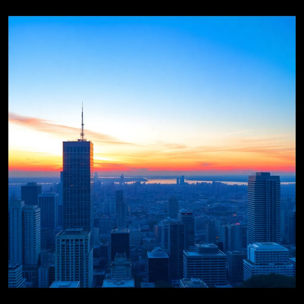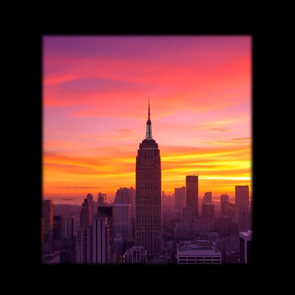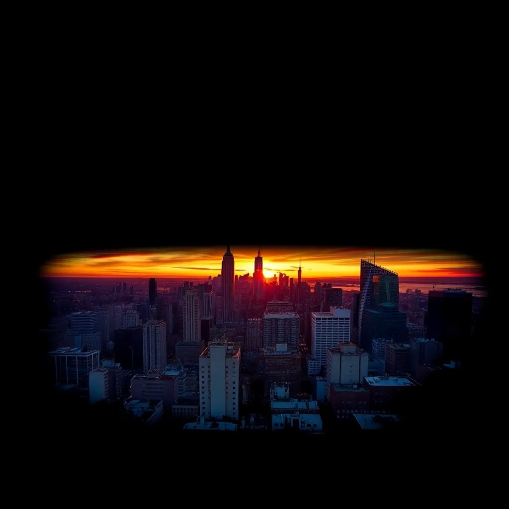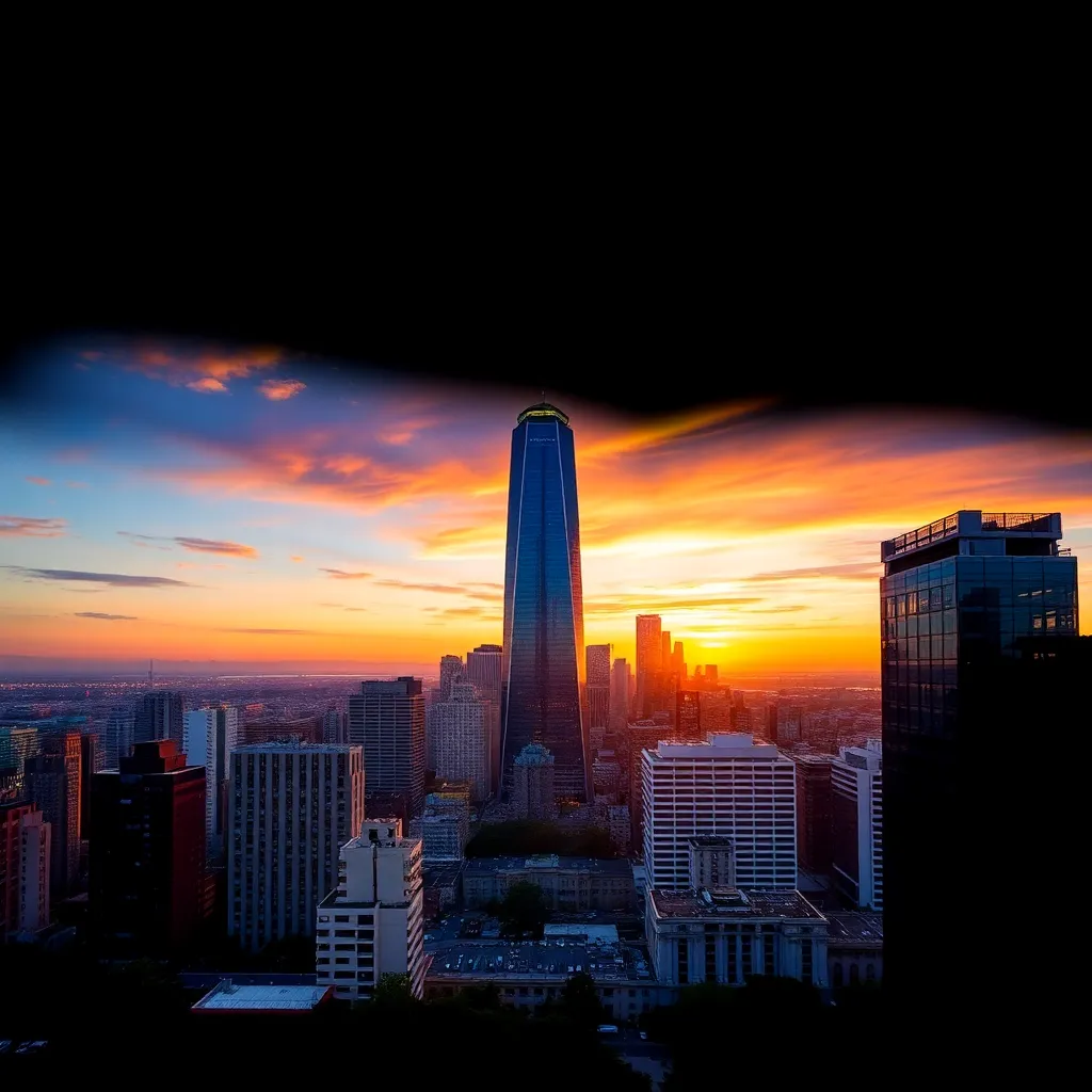 Create an AI-generated image by removing the black background from a given image. The original image features a vibrant cityscape at sunset, with a prominent skyscraper in the center. The black background is dominant, covering most of the image. Use AI to remove the black background and reveal the city's beauty.