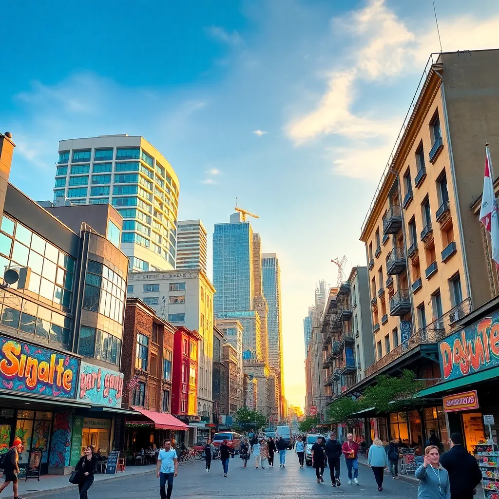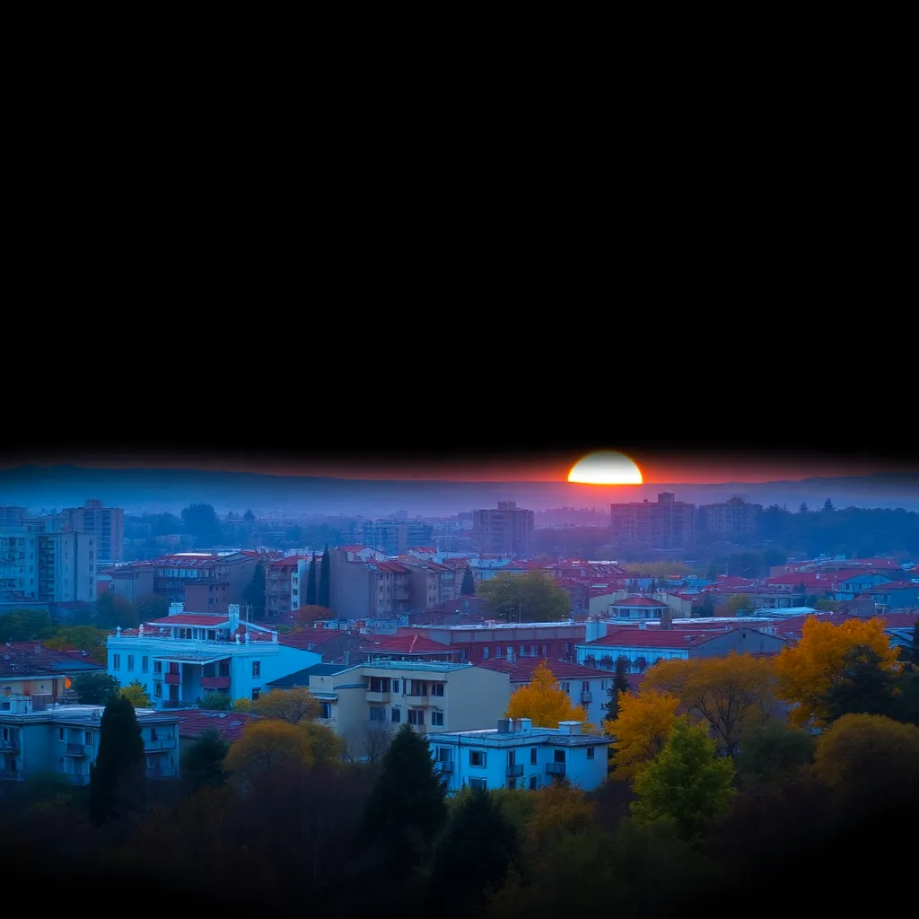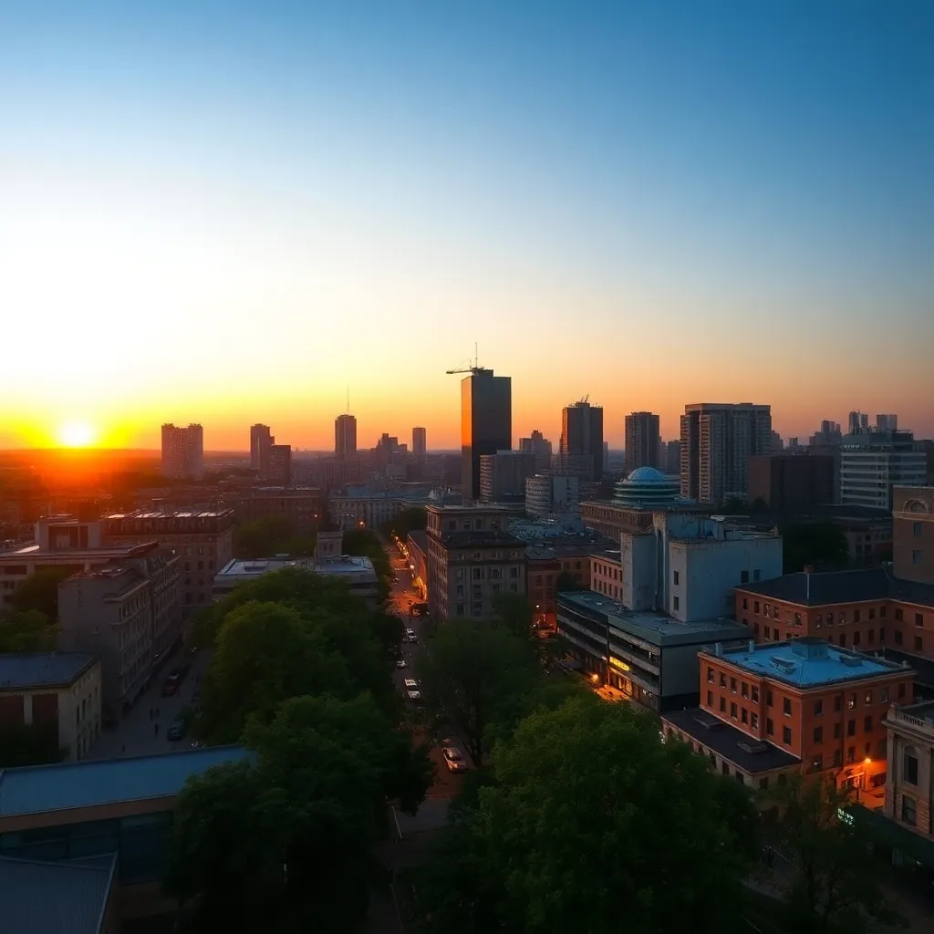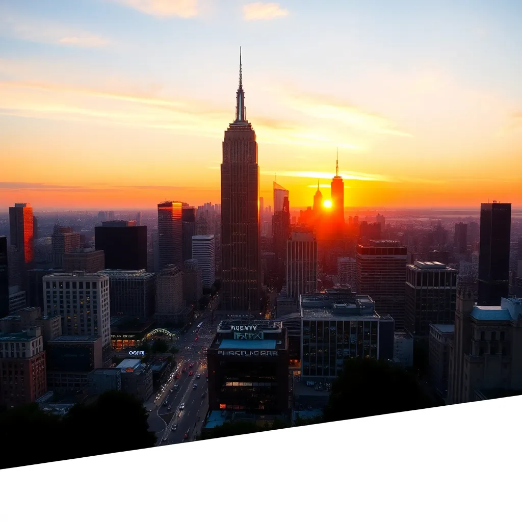 Create an AI-generated image by removing the black background from a given image. The original image features a vibrant cityscape at sunset, with a prominent skyscraper in the center. The black background is dominant, covering most of the image. Use AI to remove the black background and reveal the city's beauty.