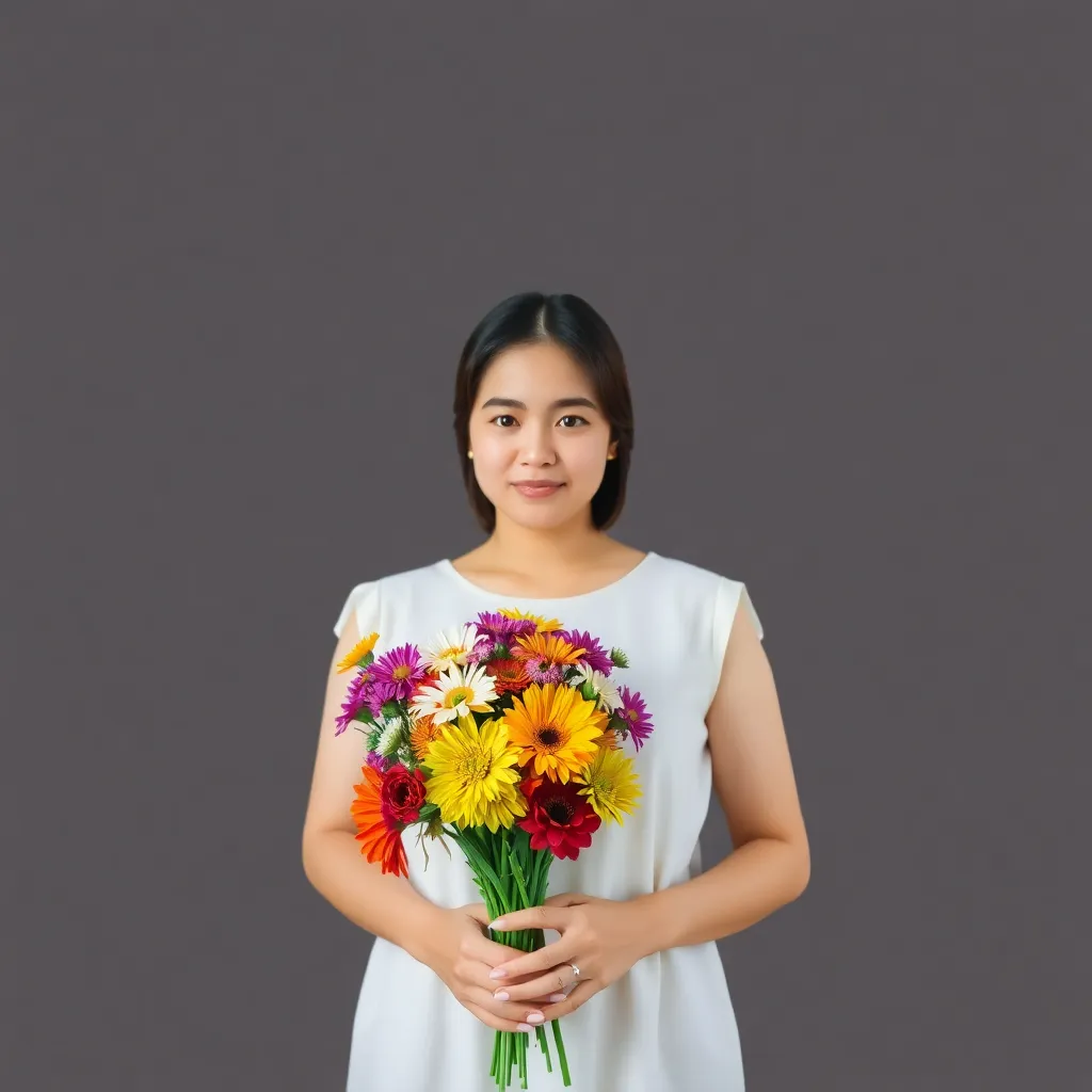 Create an AI-generated image by removing the black background from a given image. The input image features a person holding a colorful bouquet of flowers against a dark background. The goal is to generate a new image with a transparent or white background, preserving the original image's details and colors.