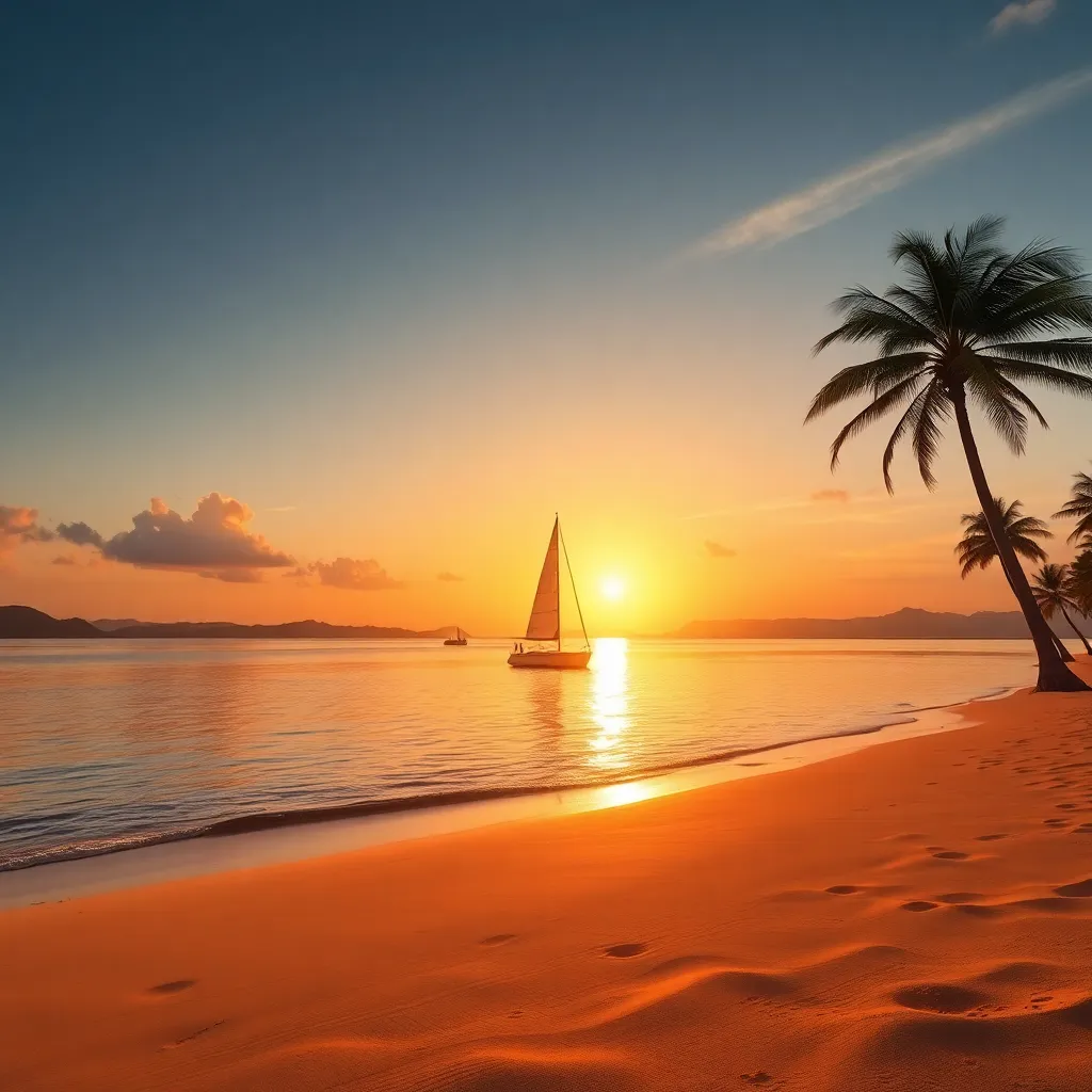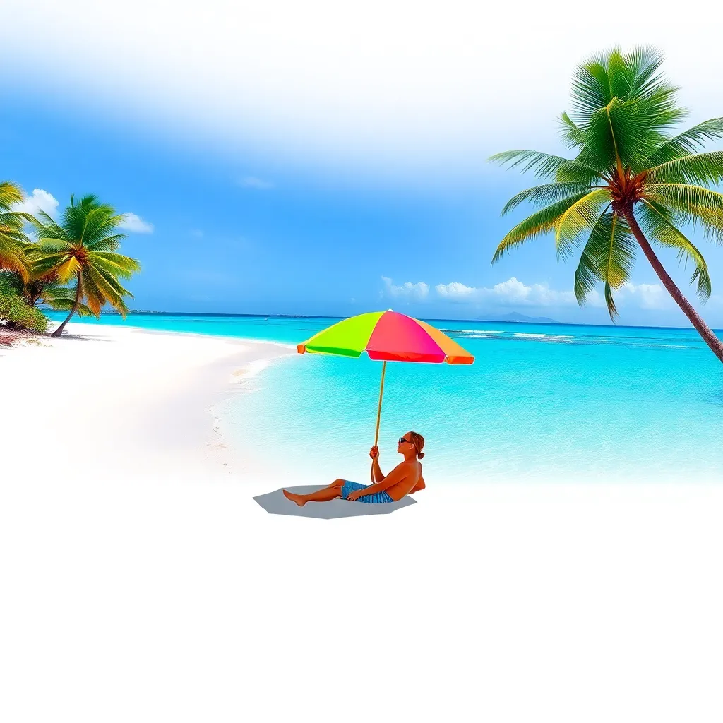 Create an AI-generated image of a vibrant beach scene with a person relaxing under a colorful umbrella. Remove the black background to reveal a stunning ocean view with clear blue waters, white sandy beach, and lush green palm trees. Make the image visually appealing and inviting for a summer vacation.