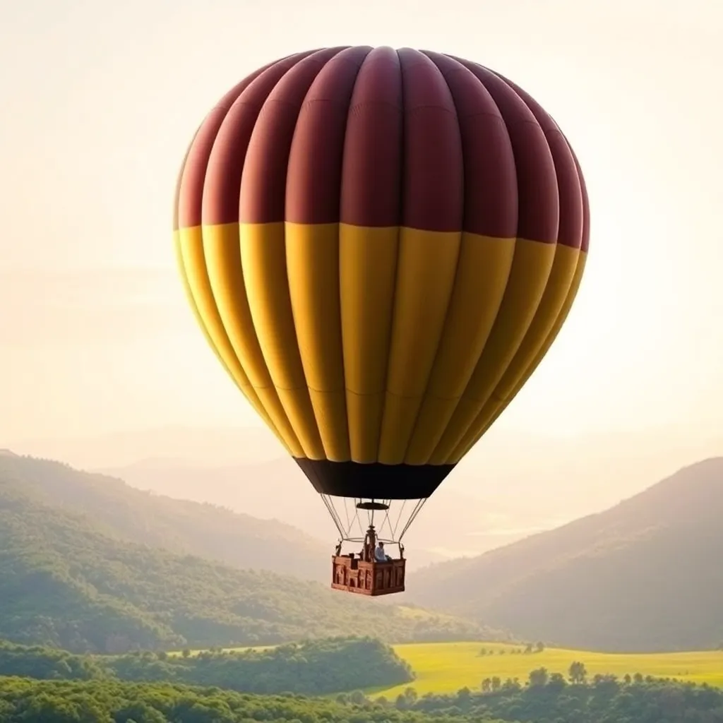 Create an AI-generated image of a vintage-inspired hot air balloon soaring above a lush green valley, with the black background removed to reveal a warm, sunny sky. Incorporate subtle texture and shading to give the balloon a sense of depth and dimensionality. Use vibrant colors to make the scene pop.