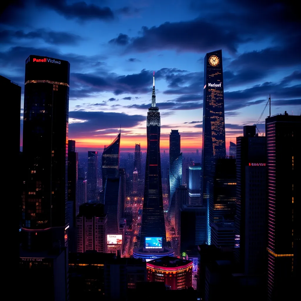 Remove the black background from a high-quality image of a futuristic cityscape at dusk, with towering skyscrapers, neon lights, and a vibrant atmosphere. The image should have a resolution of at least 1024x768 pixels, and the black background should be completely removed to reveal a stunning urban landscape.