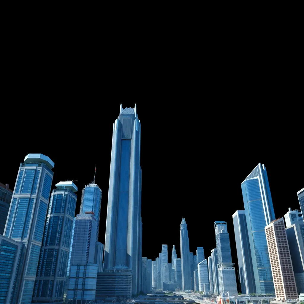 Create an AI-generated image by removing the black background from a given image. The original image features a futuristic cityscape with towering skyscrapers and a bright blue sky. The black background is distracting and hinders the viewer's focus on the city's architecture. Use AI to remove the background and enhance the image's clarity.