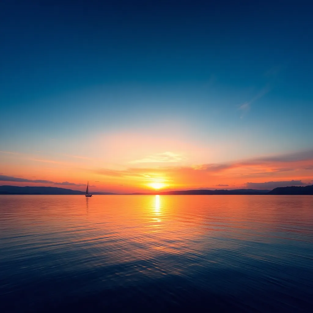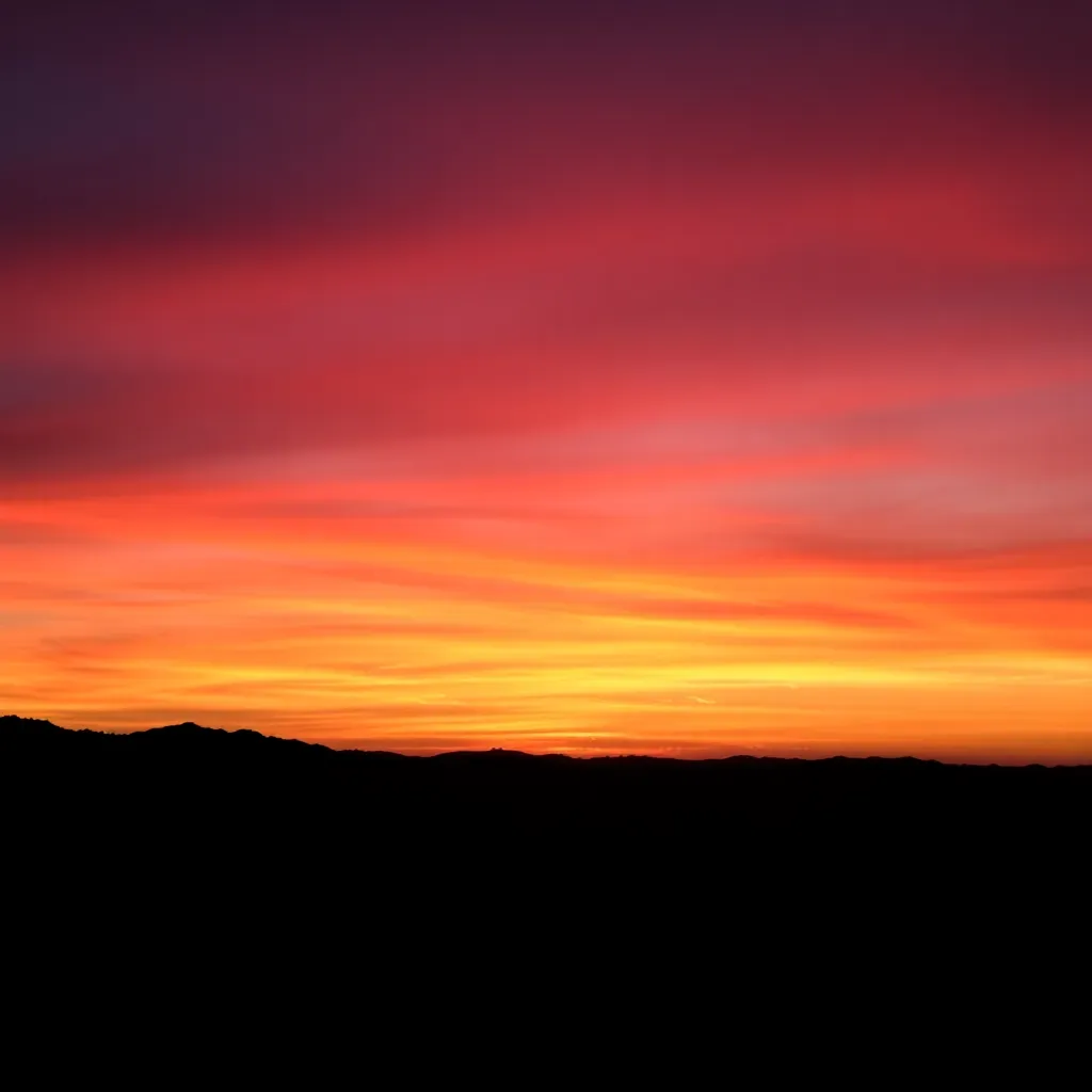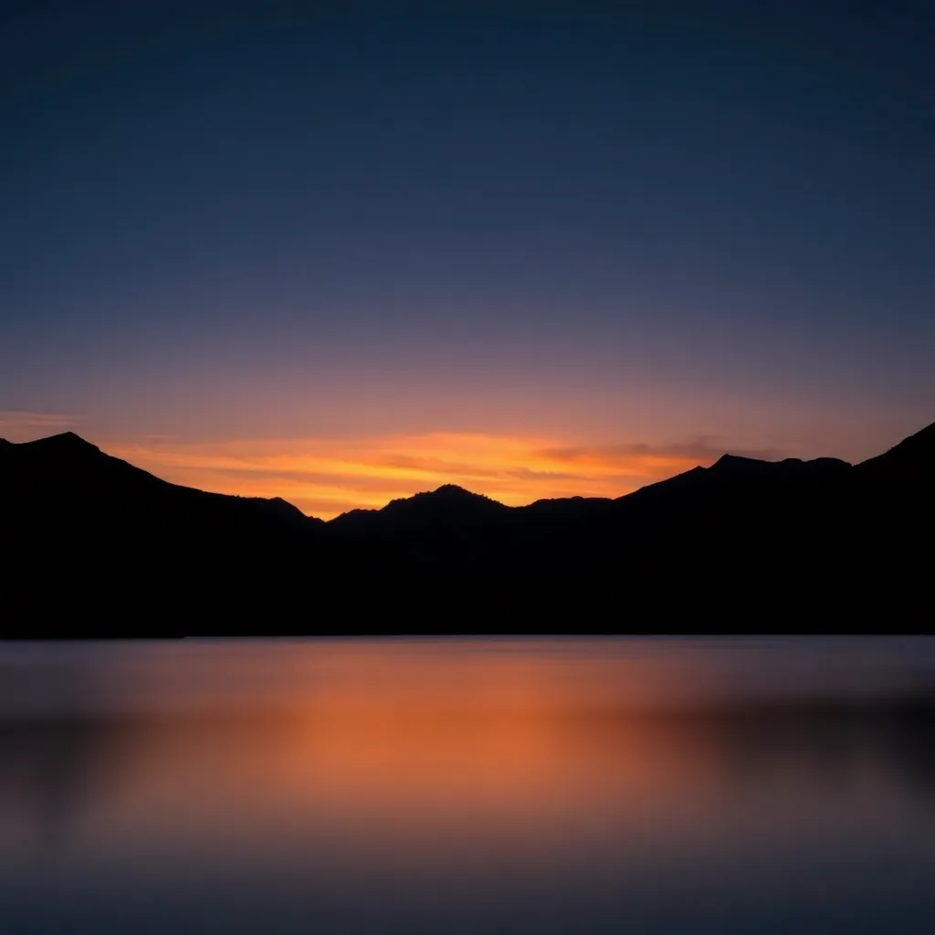 Create an AI-generated image by removing the black background from a given image. The original image features a beautiful landscape with a black silhouette of a mountain range against a dark blue sky. Use AI to remove the black background and replace it with a stunning sunset, adding warmth and depth to the scene.