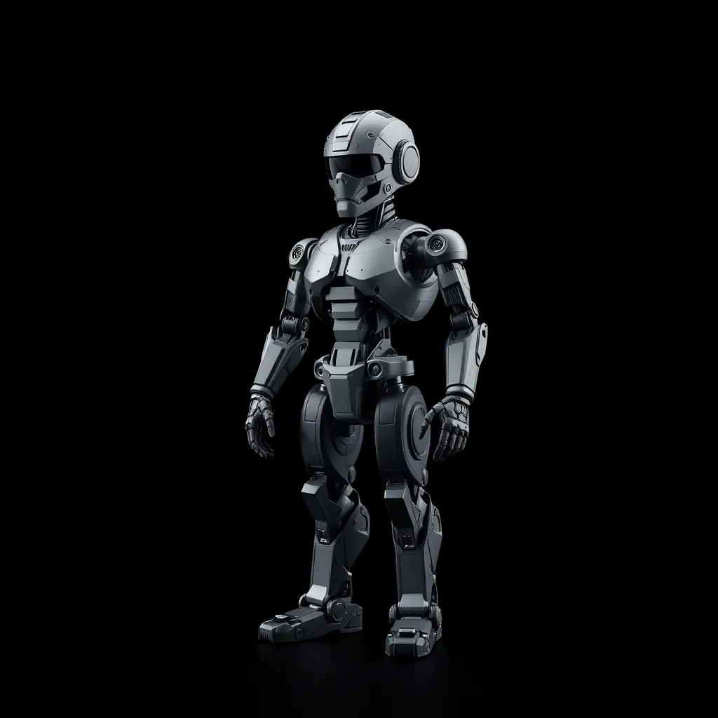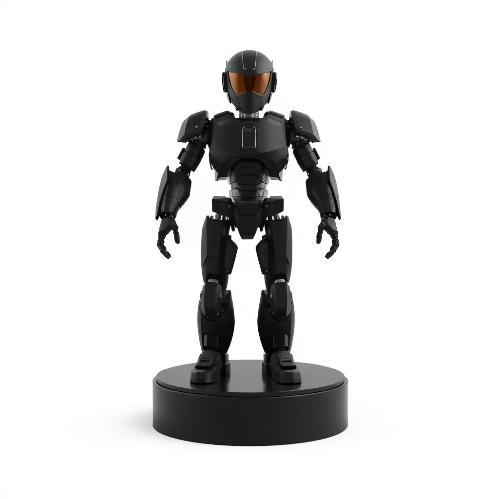 Create an AI-generated image by removing the black background from a given image. The input image features a 3D robot standing on a black pedestal, with intricate details and textures. The output should be a transparent image with a clean, white background, maintaining the robot's original details and colors.