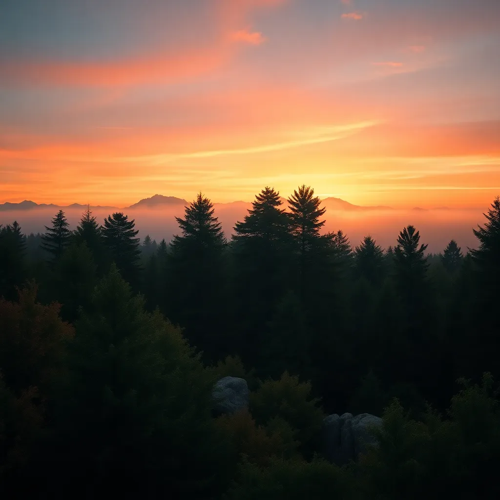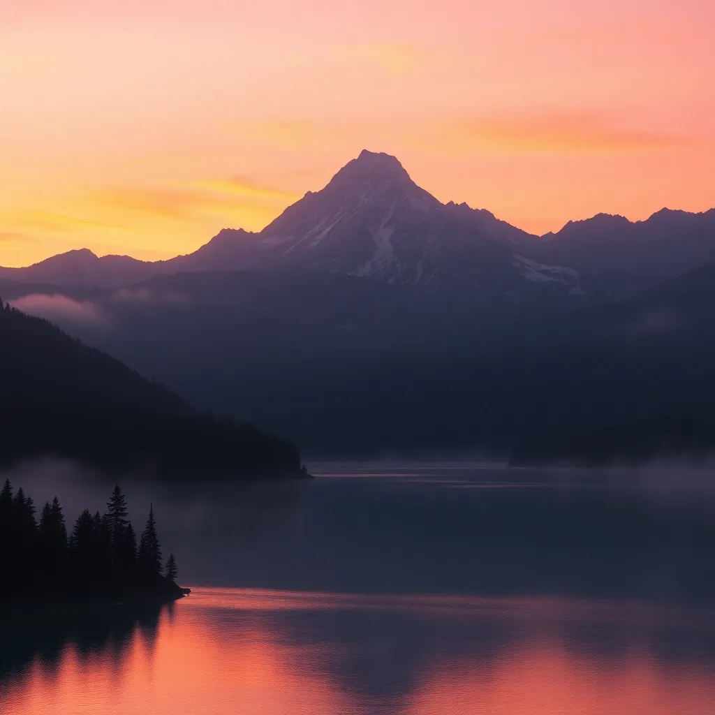 Create an AI-generated image of a majestic mountain landscape at sunset. The image should feature a prominent mountain range with a serene lake in the foreground. Remove the black background and replace it with a warm, gradient sky that transitions from orange to pink to purple. Incorporate misty fog and trees.
