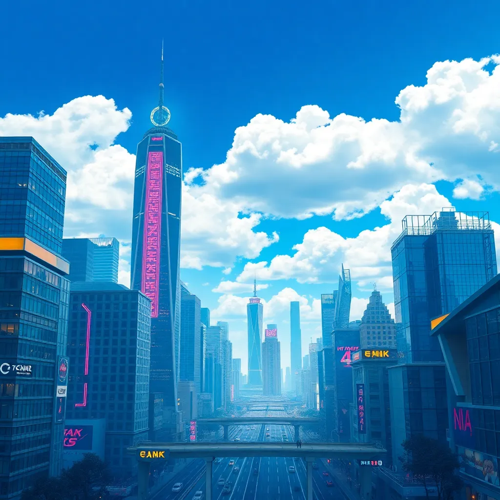 Create an AI-generated image of a vibrant, futuristic cityscape with towering skyscrapers and neon lights. Remove the black background to reveal a stunning urban landscape with a city in the foreground and a bright blue sky with puffy white clouds. Incorporate subtle details like moving cars and pedestrians.
