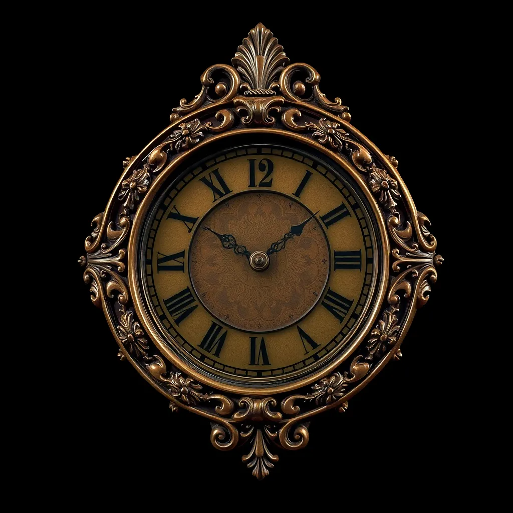 Remove the black background from a high-quality image of a vintage-style clock with intricate details, intricate carvings, and a subtle golden glow. The clock face should be prominent, with clear numbers and hands. The resulting image should have a transparent background, allowing for easy integration with other designs.
