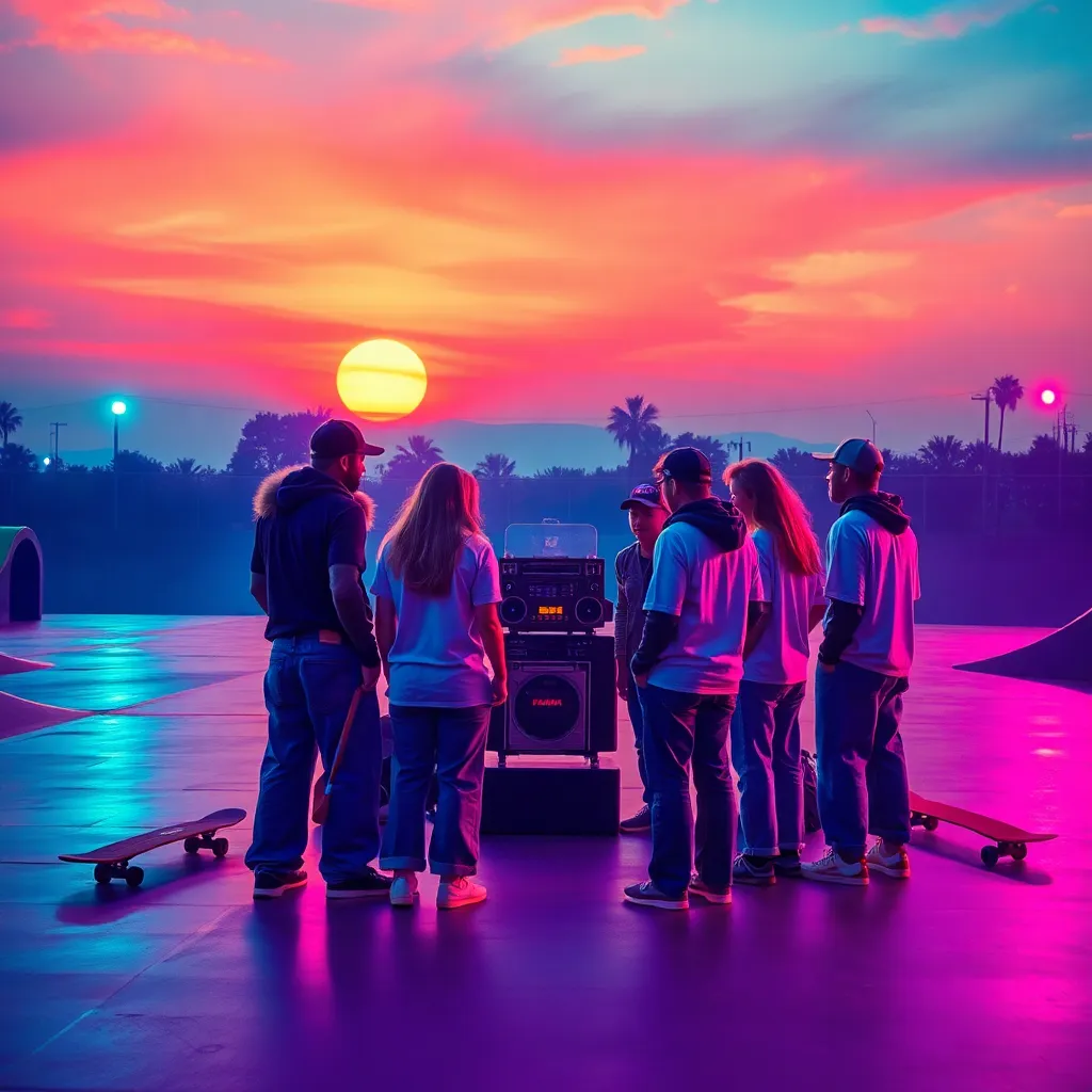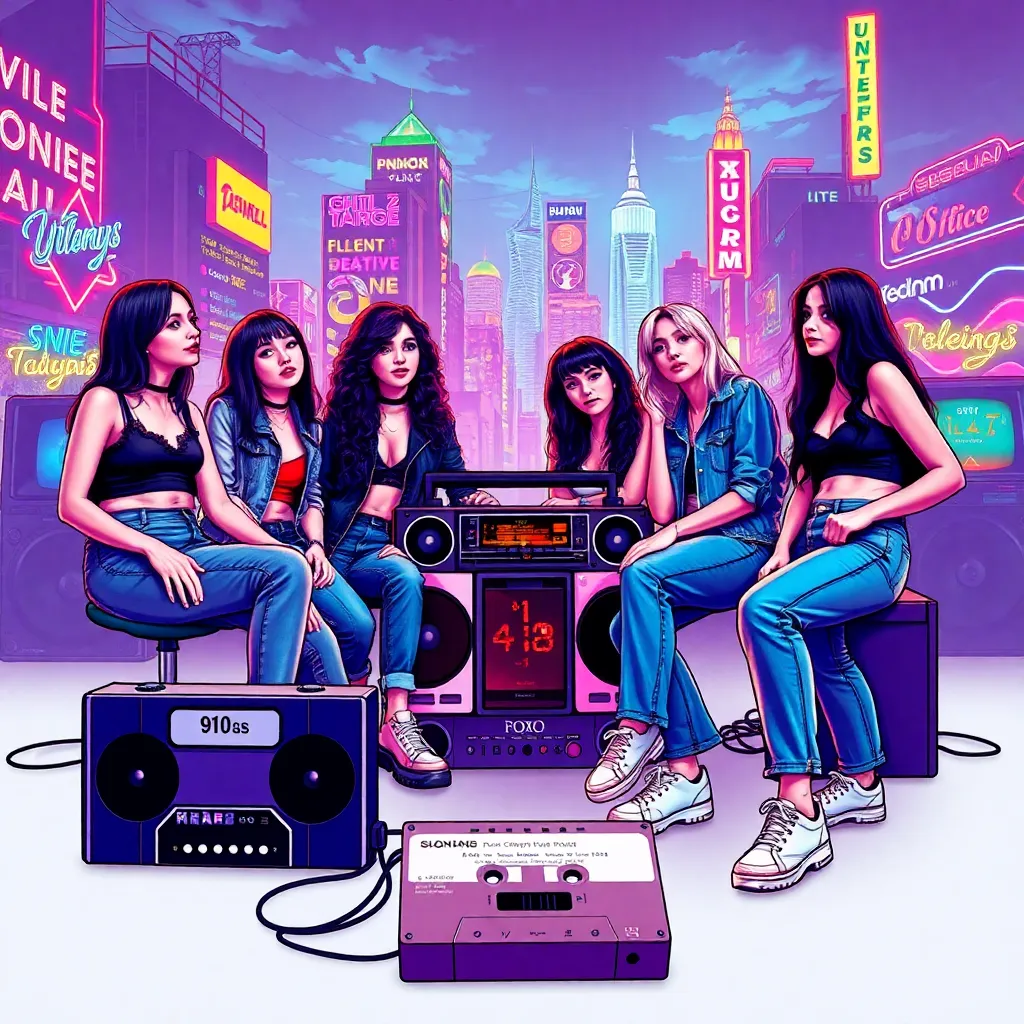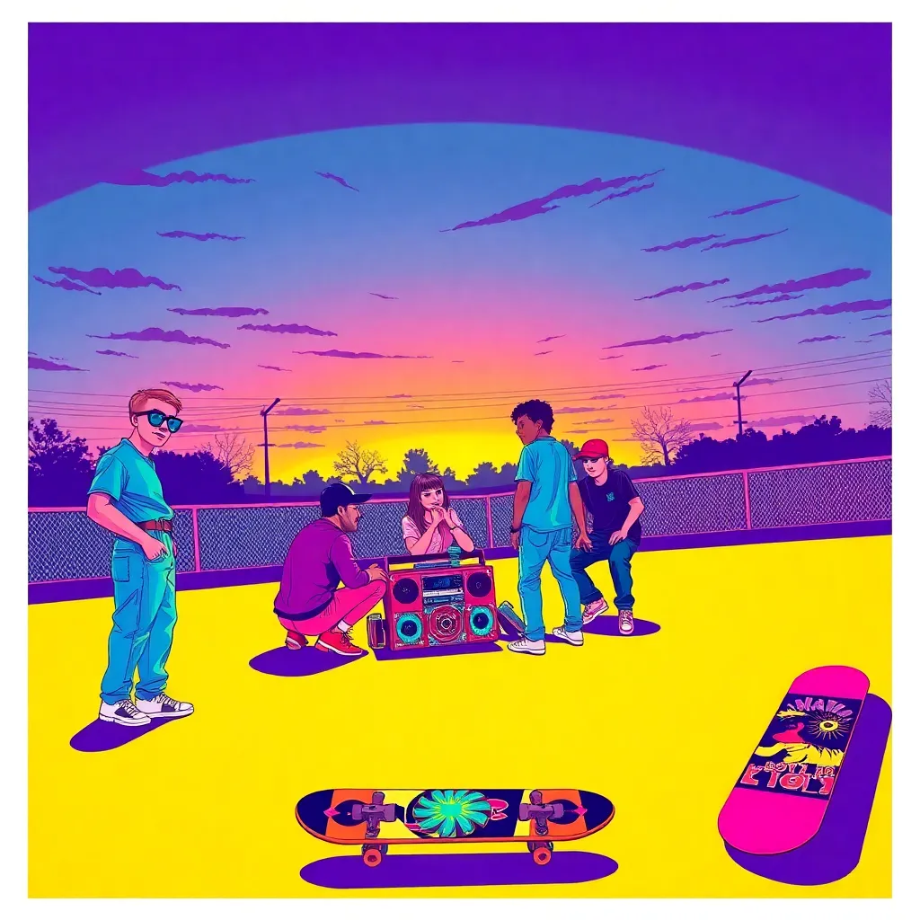 a group of friends gathered around a boombox blasting their favorite cassette tapes, surrounded by neon-colored skateboards, oversized sunglasses, and a cityscape of towering skyscrapers and retro-style billboards. Incorporate iconic 90s elements like chokers, high-waisted jeans, and chunky sneakers.