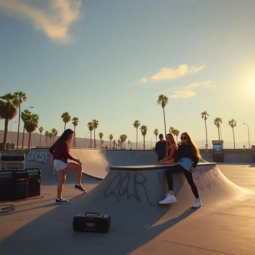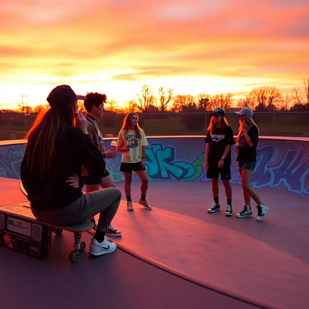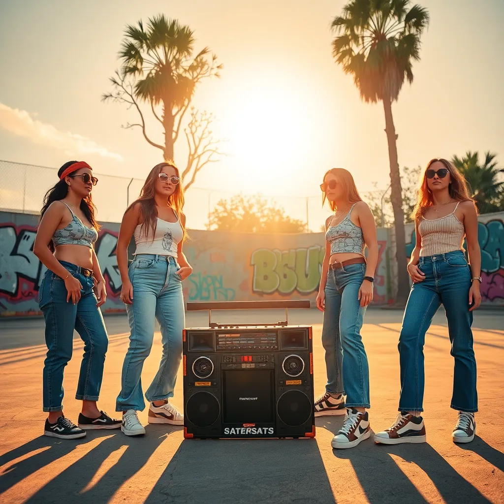 a group of friends gathered around a boombox blasting their favorite cassette tapes, surrounded by neon-colored skateboards, oversized sunglasses, and a cityscape of towering skyscrapers and retro-style billboards. Incorporate iconic 90s elements like chokers, high-waisted jeans, and chunky sneakers.