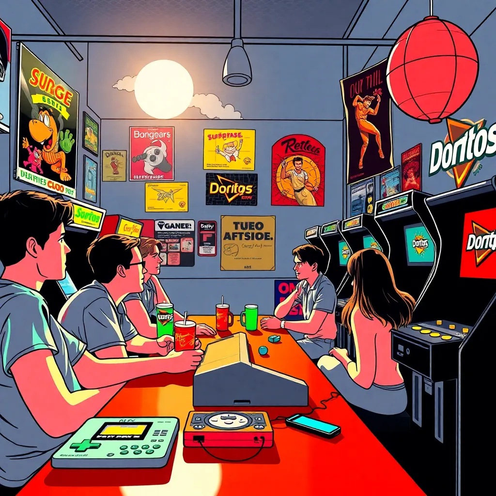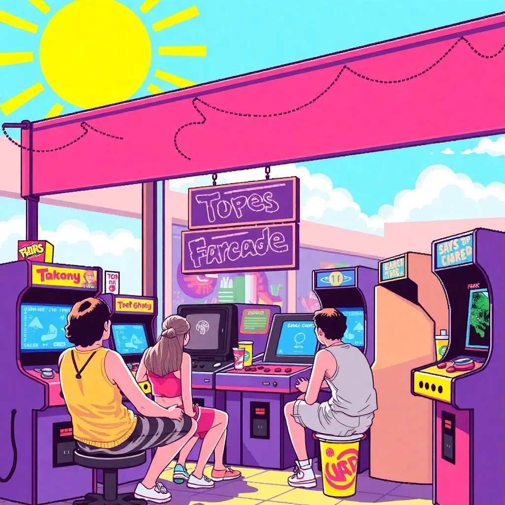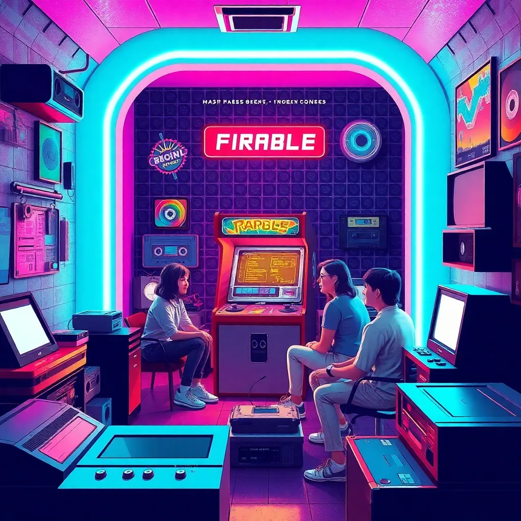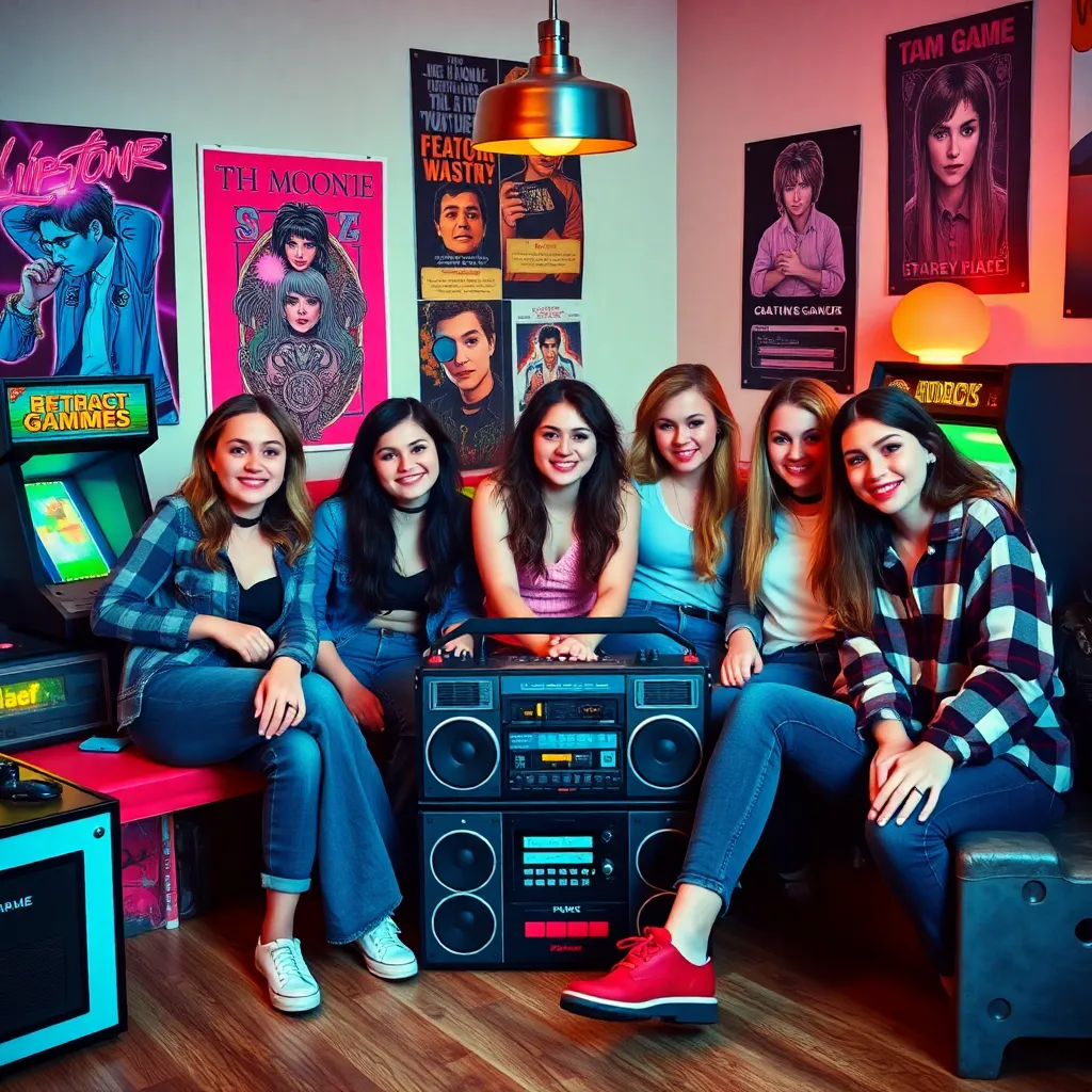 Imagine a neon-lit, pixelated scene from the 1990s. A group of friends are gathered around a retro arcade cabinet, surrounded by old-school consoles, VHS tapes, and cassette players. The atmosphere is vibrant, with a hint of nostalgia and a dash of futuristic flair. Generate an image that captures this retro-futuristic moment.