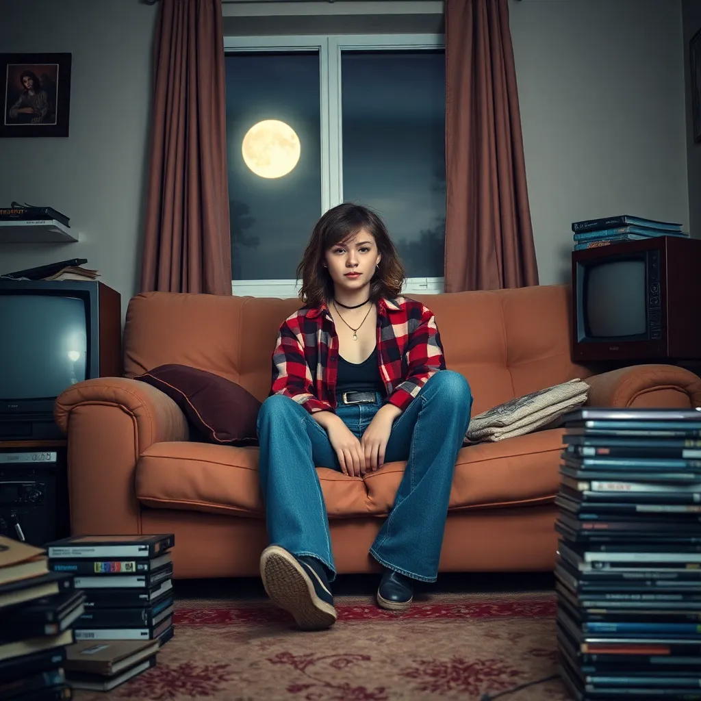 Create a nostalgic scene of a teenager sitting on a worn-out couch, surrounded by old VHS tapes, a bulky TV, and a stack of worn-out CDs. The teenager is wearing high-waisted jeans, a flannel shirt, and a choker necklace. The background is a dimly lit, retro-style bedroom with a window to the moonlit night.