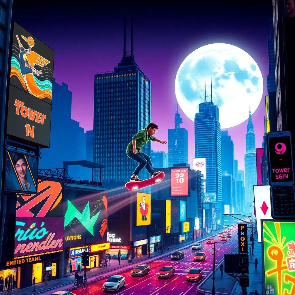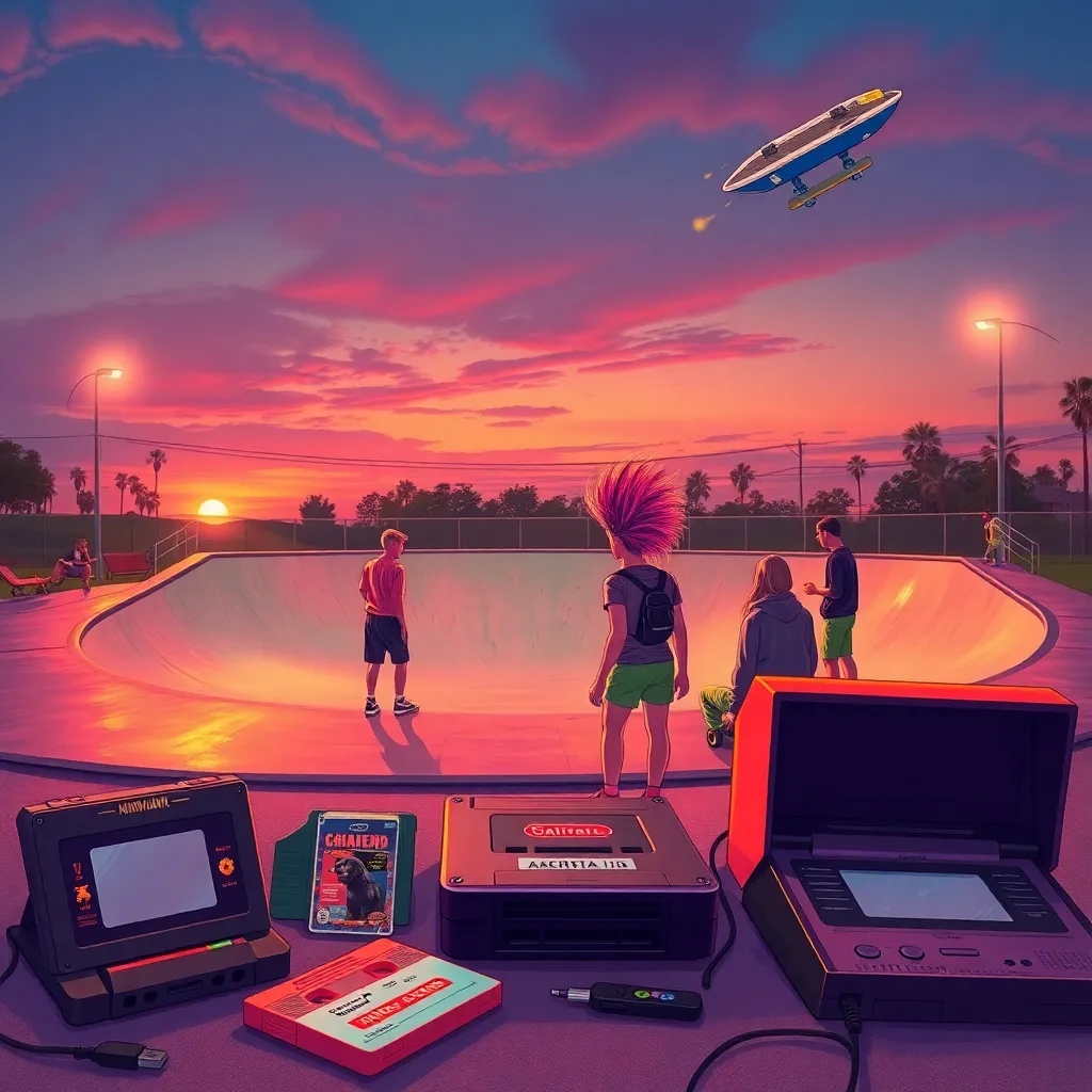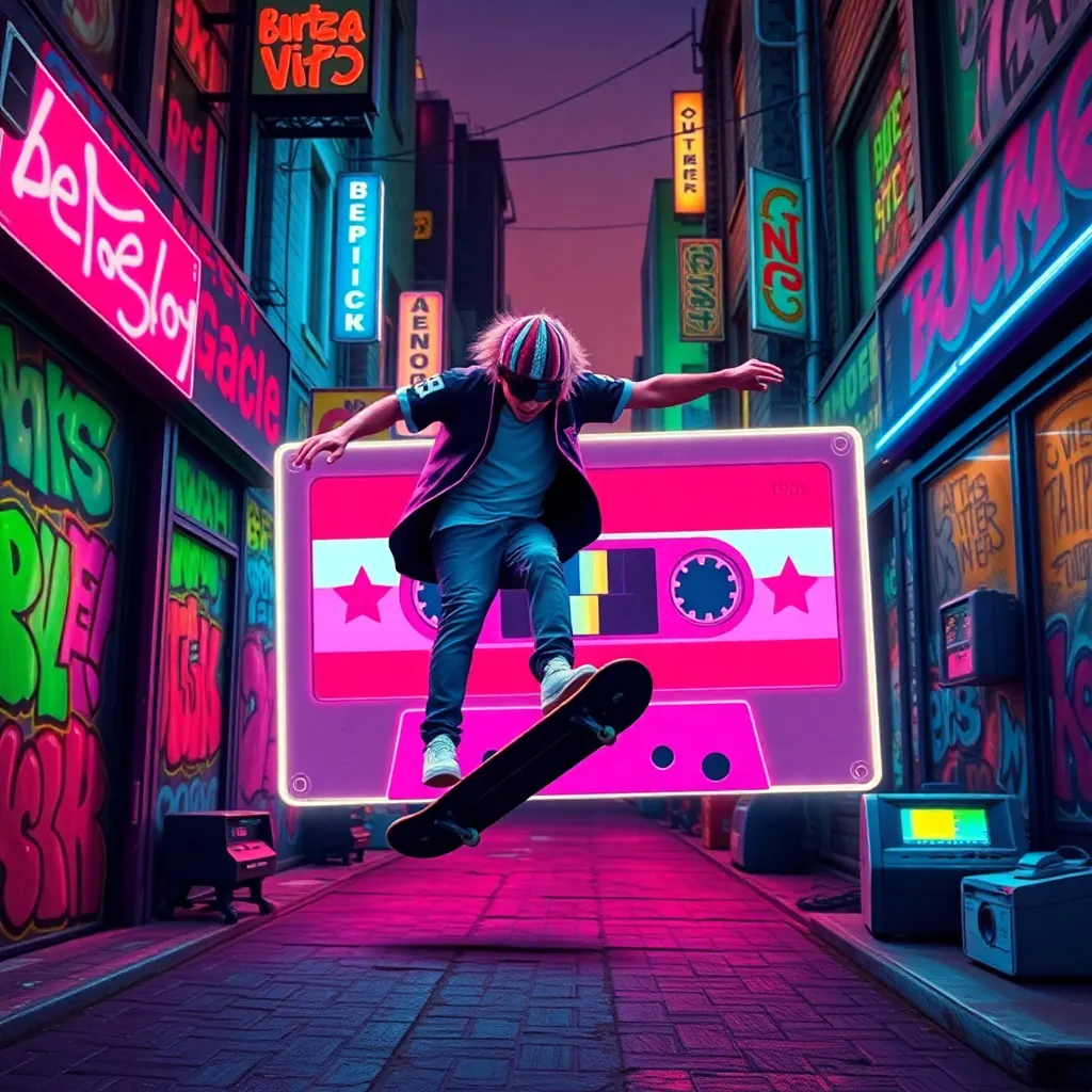 Imagine a neon-lit, graffiti-covered city street in the 1990s. A retro-style skateboarder is shown doing a trick in front of a giant, glow-in-the-dark cassette tape. The background is filled with old-school video games, beepers, and vinyl records. Create an image that captures the essence of 90s nostalgia.