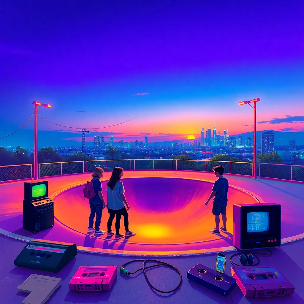Create an image that captures the essence of a retro 90s summer night. Think neon-lit skate parks, cassette tapes, and oversized sunglasses. Incorporate a nostalgic color palette, with bold pinks, blues, and yellows. The scene should evoke a sense of carefree youth and radical vibes. Get creative and take me back to the decade of grunge and gangsta rap!