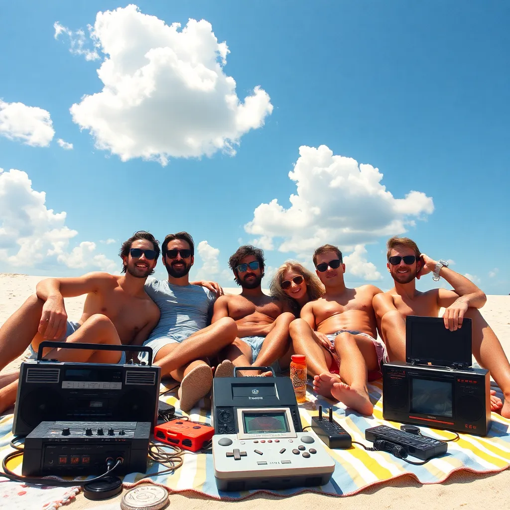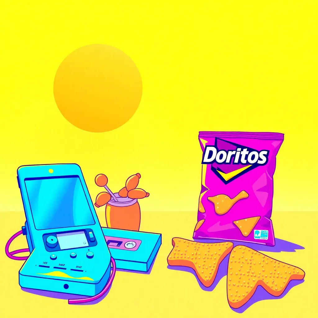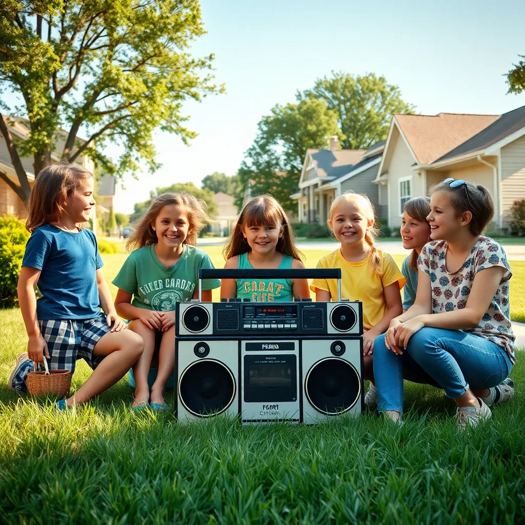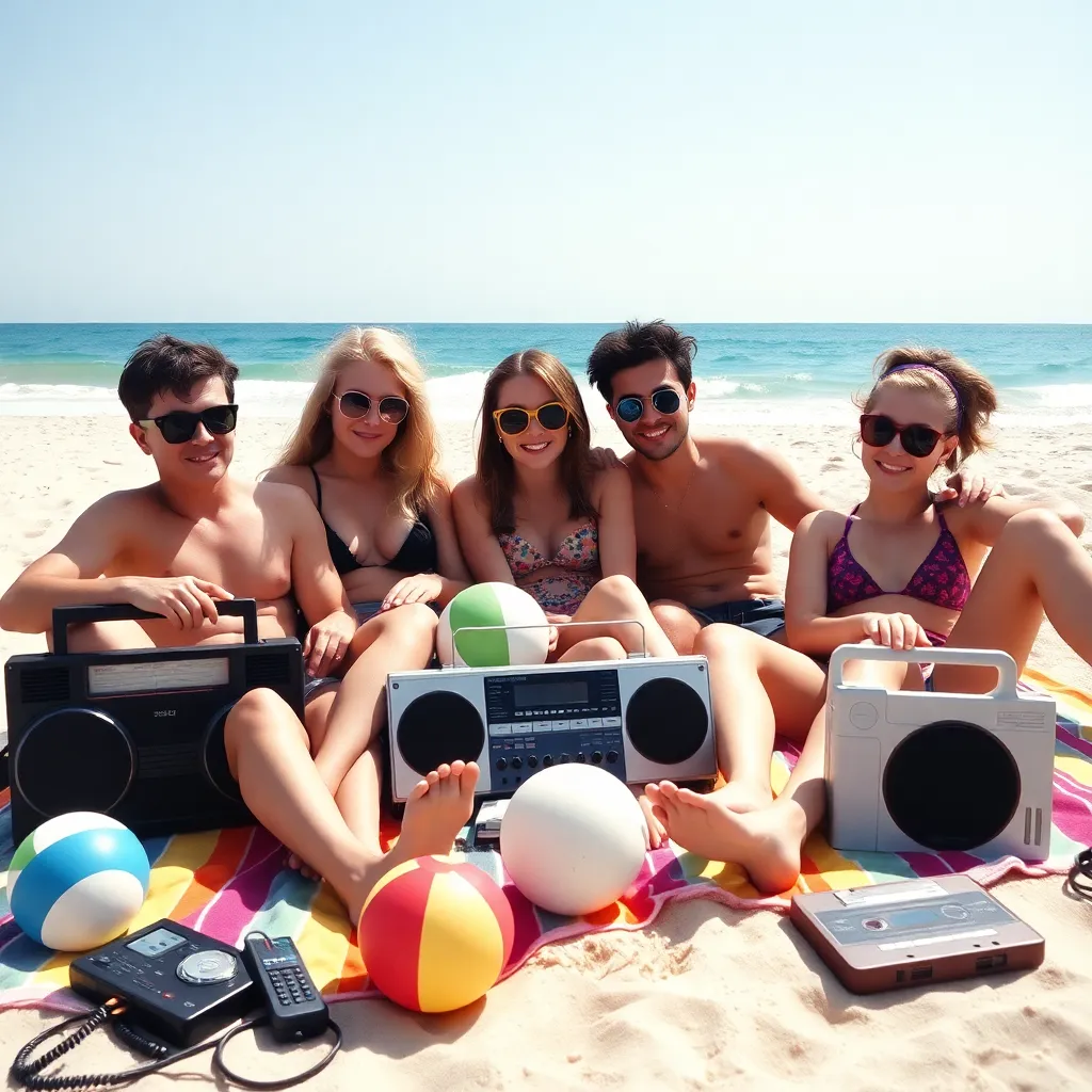 Create a nostalgic scene of a 90s summer afternoon. A group of friends are gathered around a boombox, surrounded by neon-colored cassette tapes, oversized sunglasses, and a vintage video game console. The sun is setting behind them, casting a warm orange glow. Incorporate retro patterns and bold graphics.