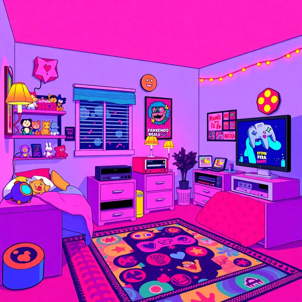 Imagine a neon-lit, graffiti-covered cityscape in the midst of a retro-futuristic rave party. A group of friends in oversized flannel shirts and high-waisted jeans are dancing to a thumping techno beat beneath a giant, glowing '90s-style logo. The air is thick with fog machines and the scent of patchouli.