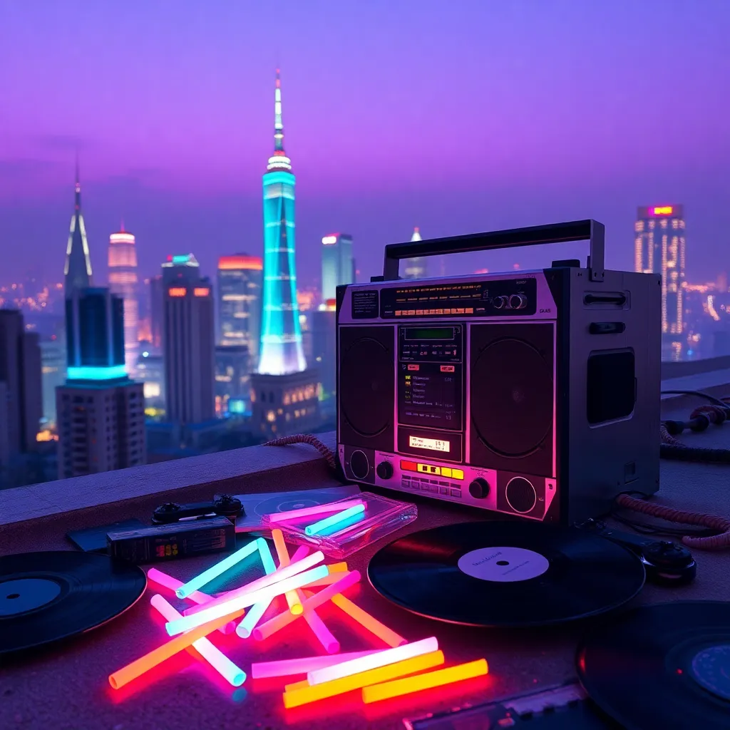 Create a retro 90s-inspired image featuring a neon-lit cityscape at dusk, with a boombox blasting tunes on a rooftop, surrounded by vintage cassette tapes, vinyl records, and a scattering of glow sticks. Incorporate iconic 90s elements like choker necklaces, high-waisted jeans, and a Walkman, all set against a hazy, purple-hued sky.