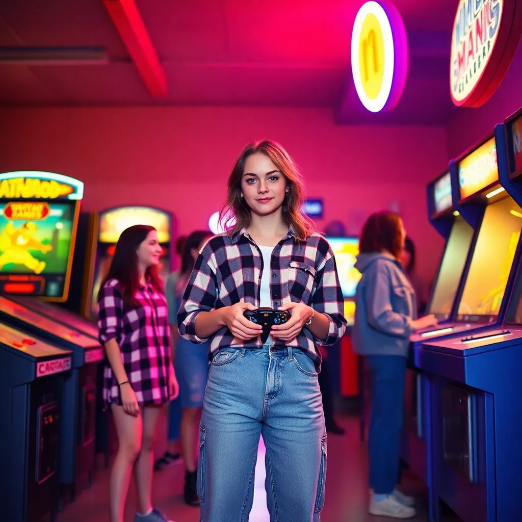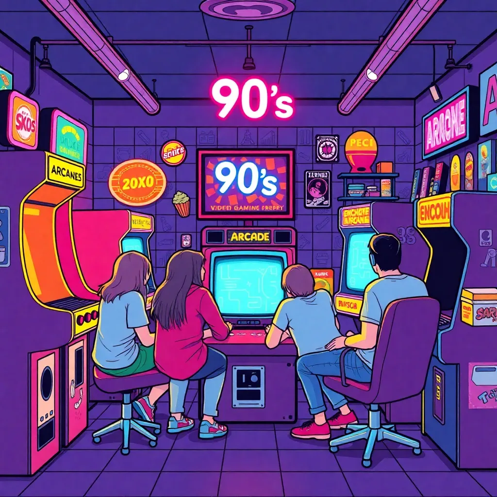 Create a nostalgic scene set in a retro 90s arcade, featuring a group of friends gathered around a classic video game console, surrounded by neon-lit arcade machines, pixelated graphics, and retro-themed snacks. Incorporate bold colors, chunky fonts, and a dash of pixel art to capture the essence of the decade.