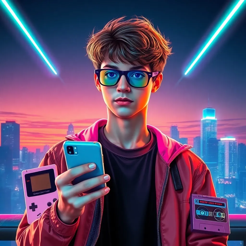 Create a futuristic, neon-lit cityscape inspired by the radical decade of the 1990s. Incorporate iconic elements like cassette tapes, flip phones, and oversized sunglasses. Blend retro-futuristic architecture with a dystopian atmosphere, as if the city is on the cusp of a technological revolution. Add a hint of cyberpunk flair.