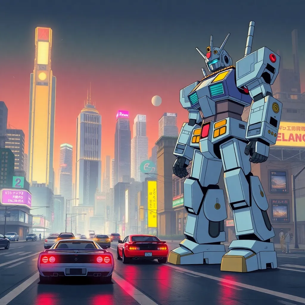 Create a futuristic cityscape in the style of 1990s anime, with neon-lit skyscrapers, hovercars zipping by, and a giant robot standing guard. Incorporate iconic 90s elements like cassette tapes, pagers, and chunky sneakers. The atmosphere should be a mix of excitement, nostalgia, and retro-futurism.