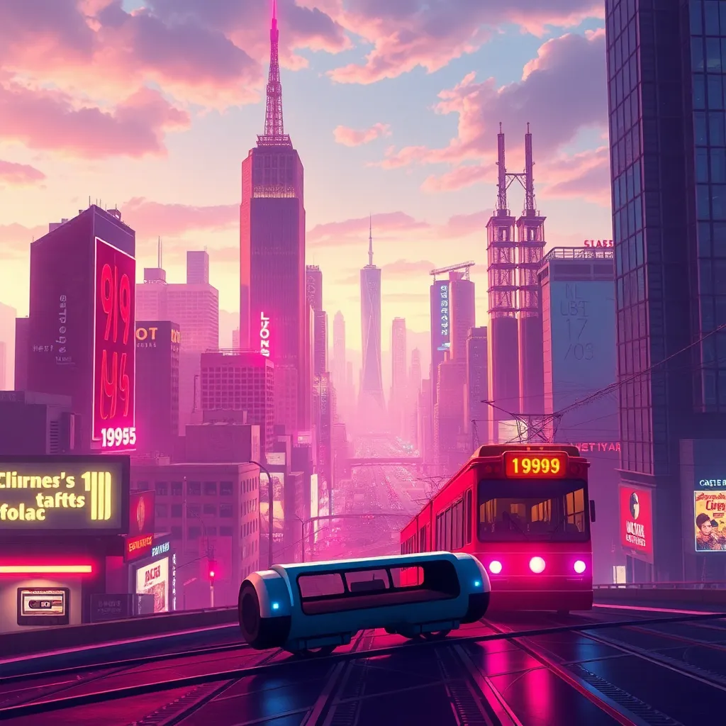 Create a futuristic yet nostalgic image of a 1990s cityscape at sunset, featuring towering skyscrapers, neon-lit billboards, and a bustling street filled with old-school video game arcades, pagers, and cassette tapes. Incorporate retro-futuristic elements like hoverboards and robots amidst the urban landscape.