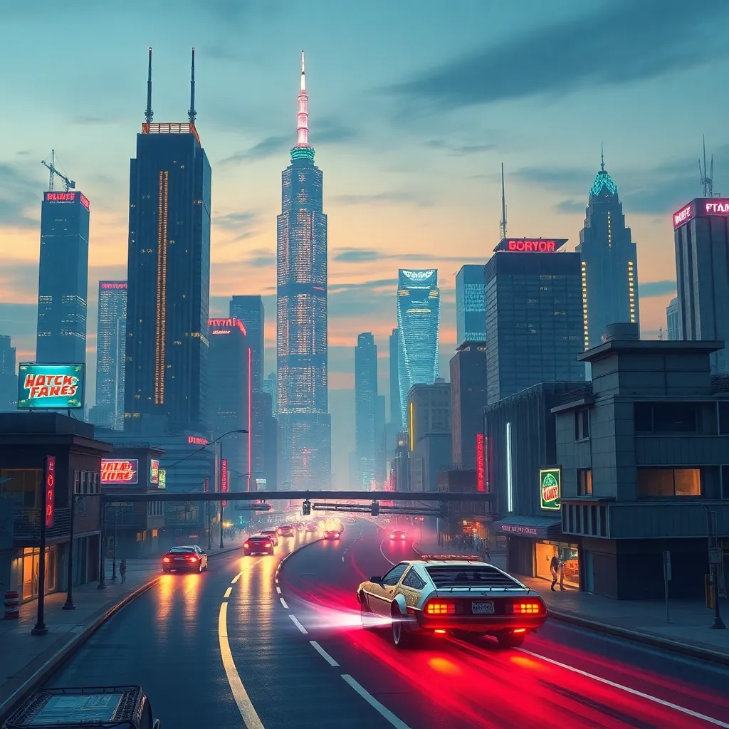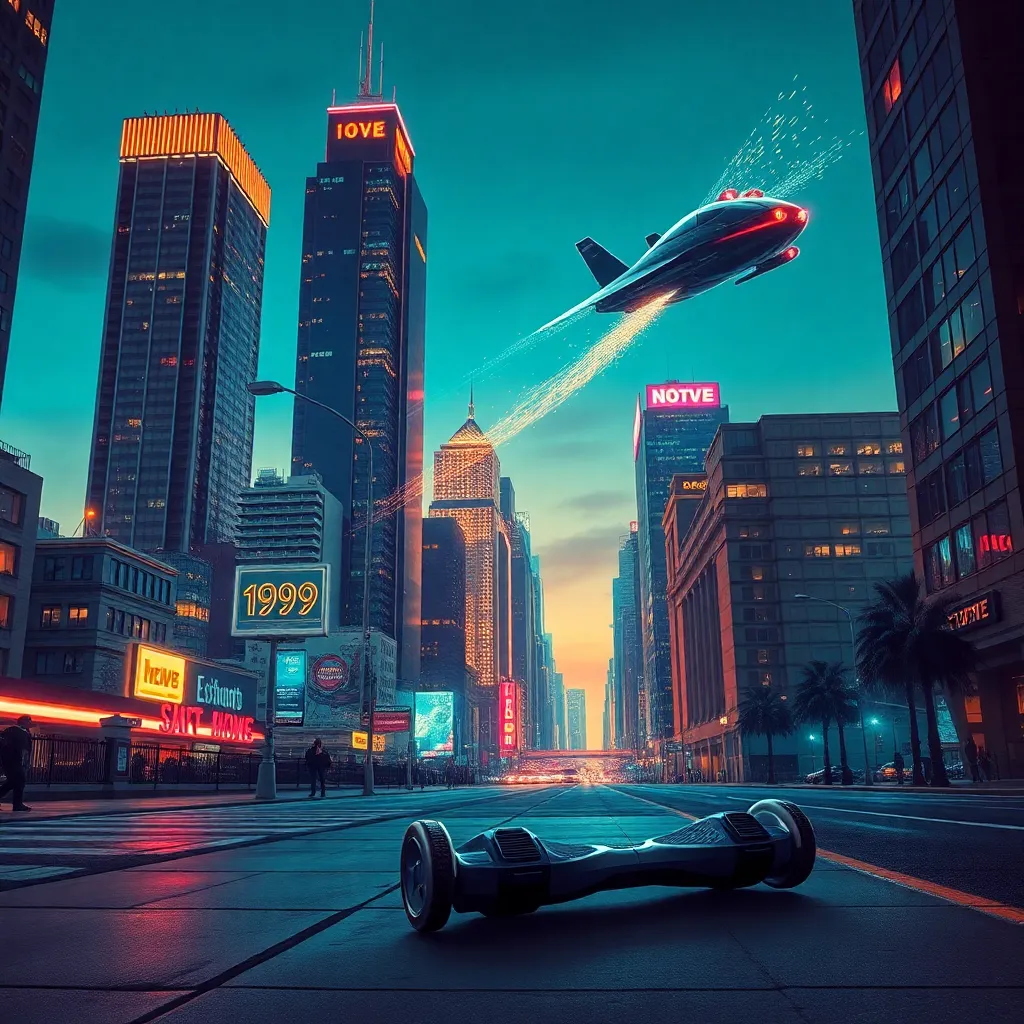 Create a futuristic cityscape at dusk in the year 1999. Neon lights illuminate the towering skyscrapers, while a hoverboard lies abandoned on the sidewalk. A retro-futuristic flying car soars above, leaving a trail of sparks. Incorporate bold, vibrant colors and a sense of nostalgia for the turn of the millennium.