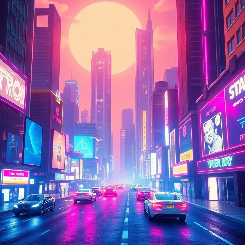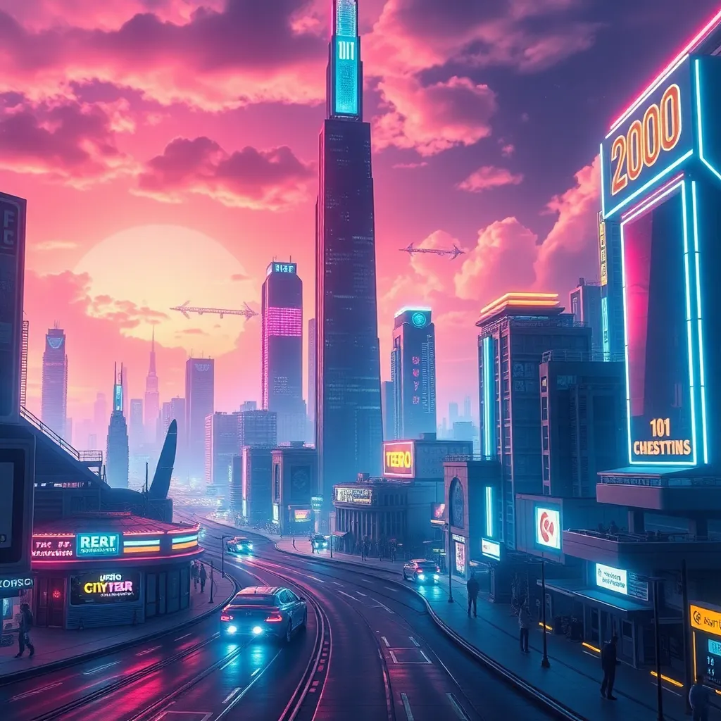 Create a futuristic cityscape at sunset, inspired by the Y2K era. Incorporate retro-futuristic elements such as neon lights, towering skyscrapers, and flying cars. The city should be bustling with activity, with people of all ages enjoying the vibrant atmosphere. The sky should be painted with hues of pink and orange.