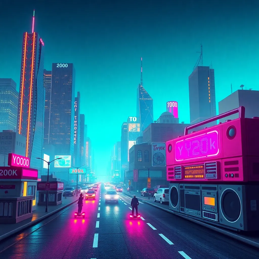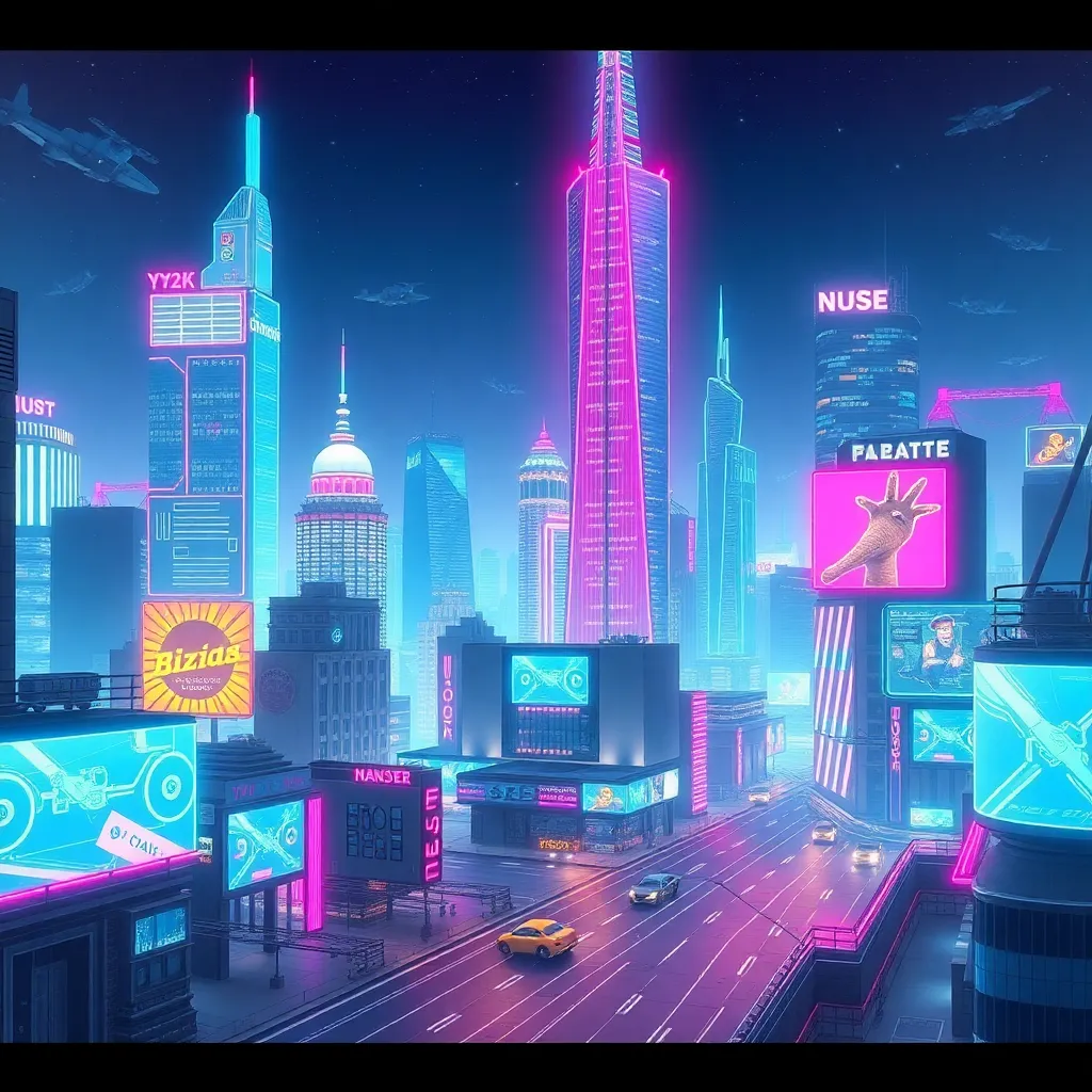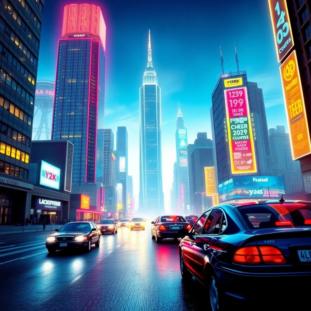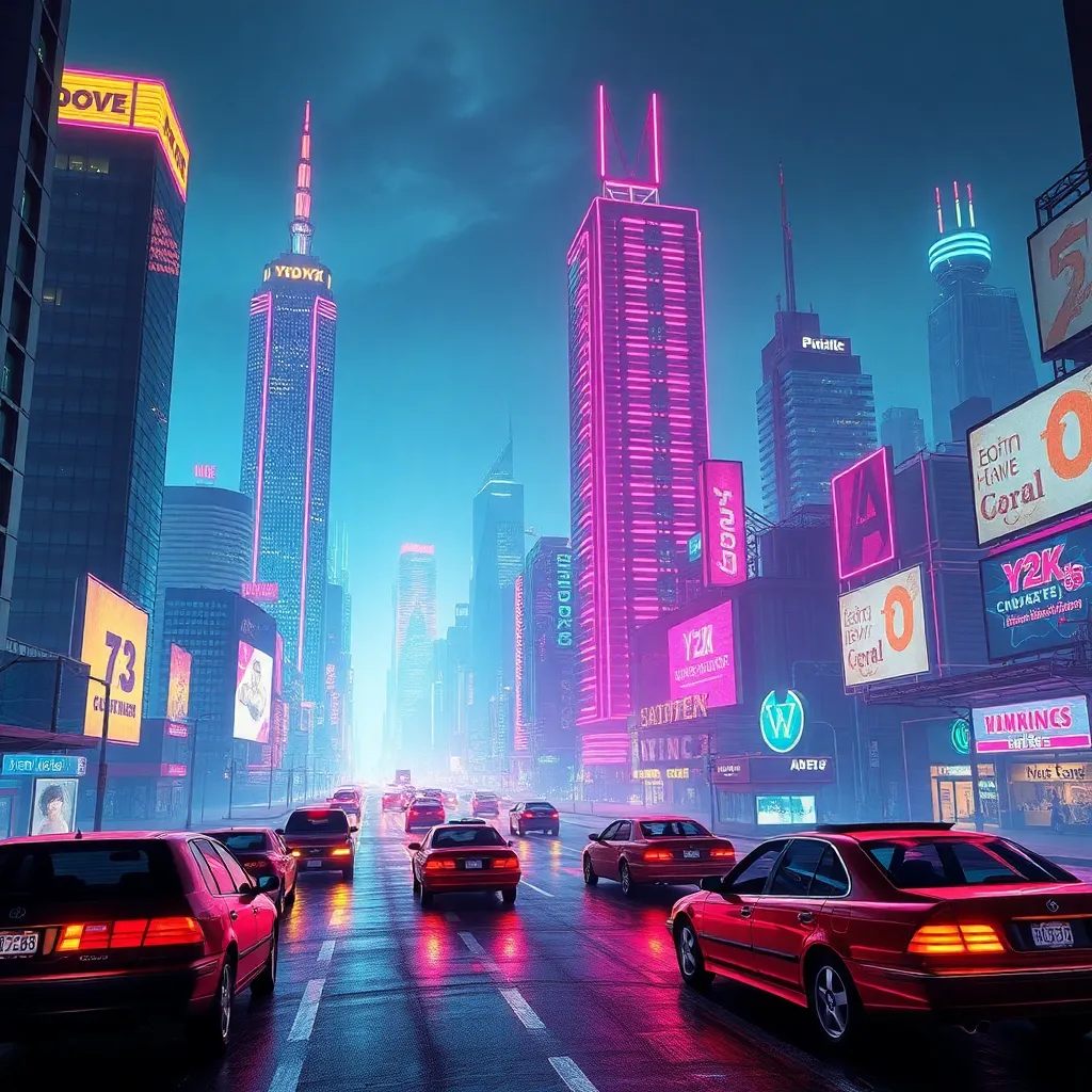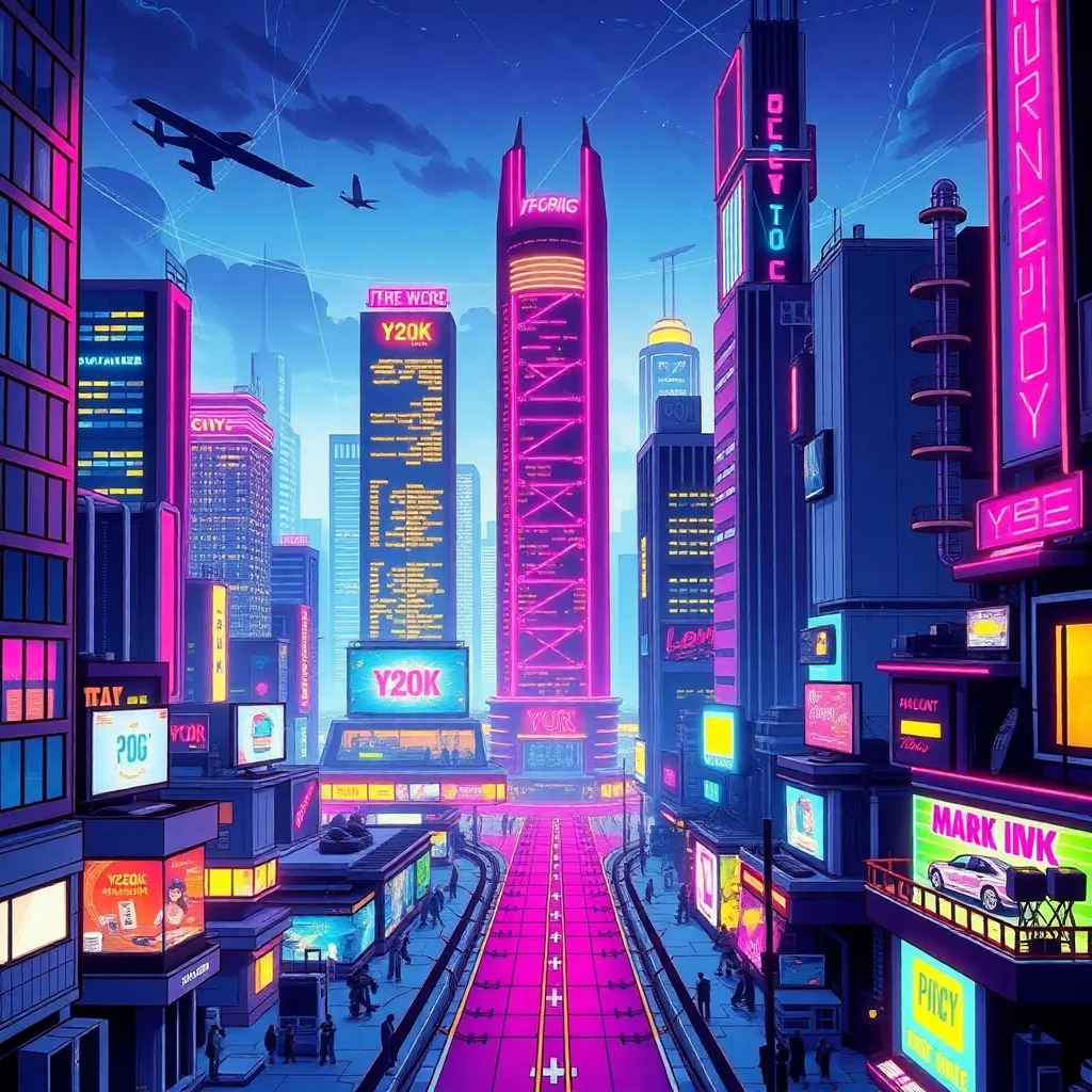 Create a futuristic cityscape inspired by the Y2K era. Imagine a neon-lit metropolis with towering skyscrapers, flying cars zipping by, and holographic advertisements. Incorporate nostalgic elements like flip phones, cassette tapes, and low-rise jeans. The city should exude a sense of retro-futurism and nostalgia for the early 2000s.