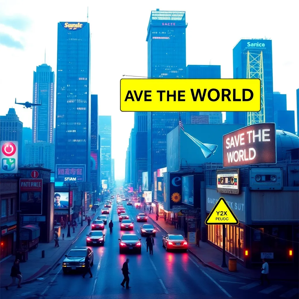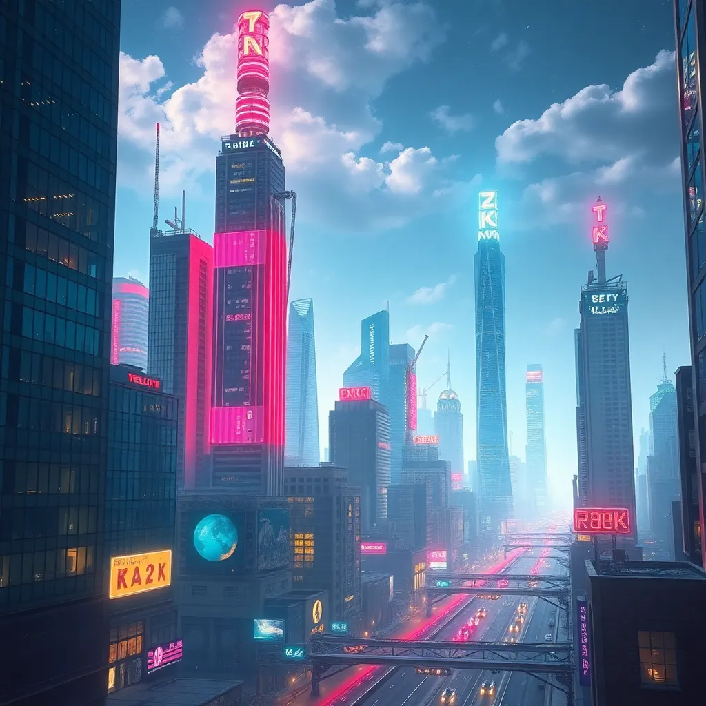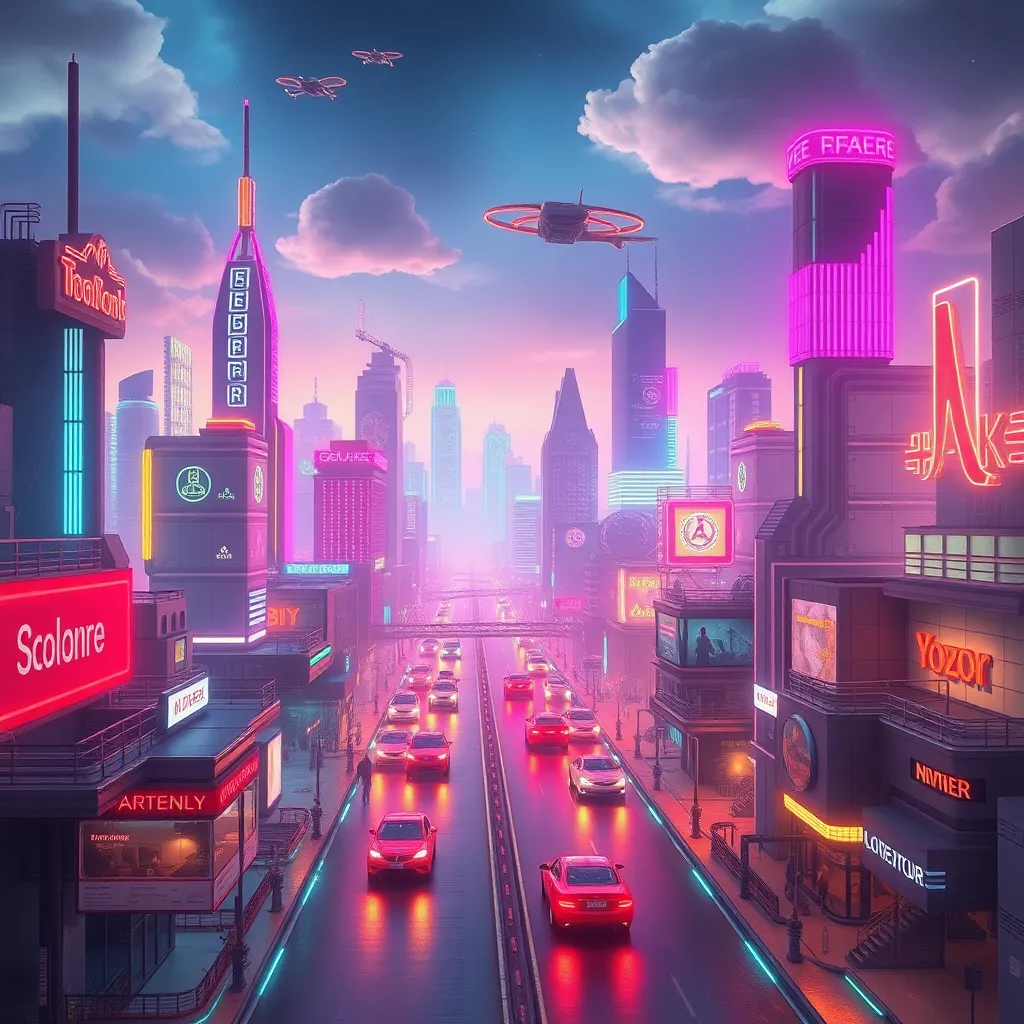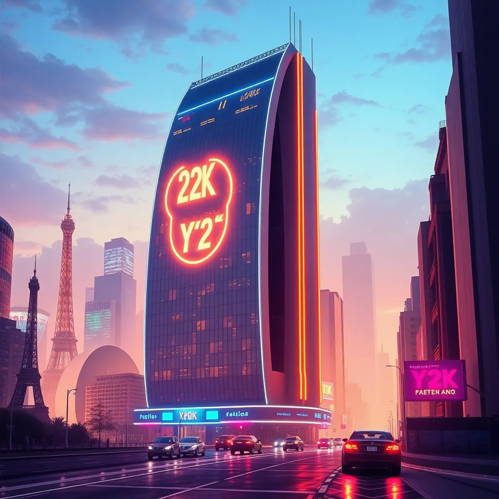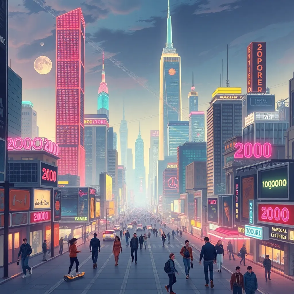 Create a futuristic cityscape with a nostalgic twist. Imagine a bustling metropolis with towering skyscrapers, neon lights, and retro-futuristic architecture inspired by the Y2K era. Incorporate iconic elements like flip phones, cassette tapes, and low-rise jeans to transport viewers back to the dawn of the 21st century.