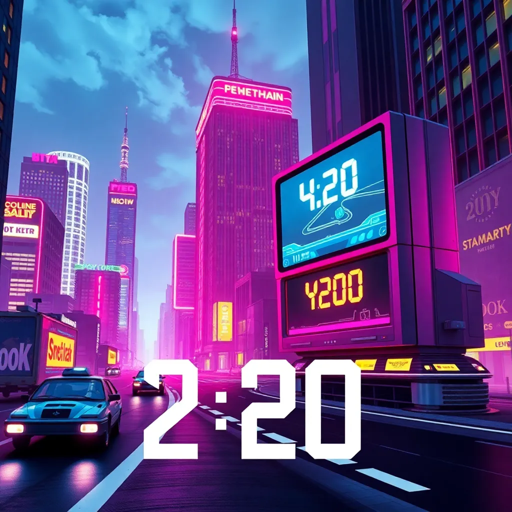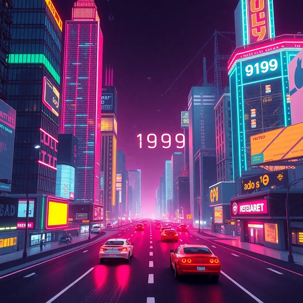 Generate an AI image of a futuristic cityscape in 1999, with neon-lit skyscrapers, flying cars zipping by, and a giant digital clock tower displaying the year 1999. Incorporate retro-futuristic elements like chunky pixel art and low-res graphics, with a hint of nostalgia and a dash of cyberpunk flair.