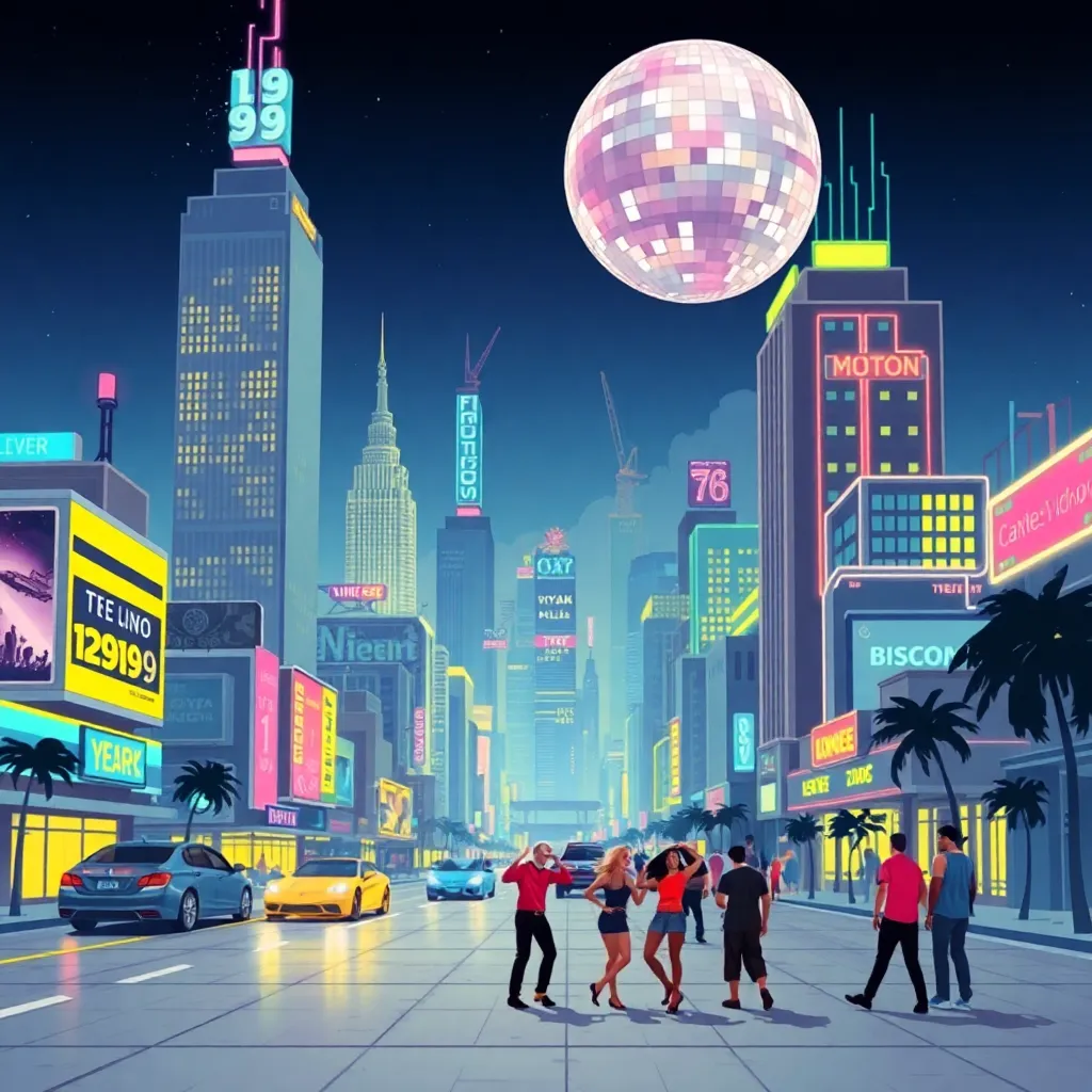 Generate an image of a futuristic cityscape set in the year 1999, with neon-lit skyscrapers, flying cars zipping by, and a giant disco ball hovering above the city. Incorporate a retro aesthetic with pixelated graphics and a vibrant color palette. Include a group of people dancing and having fun in the streets.